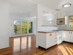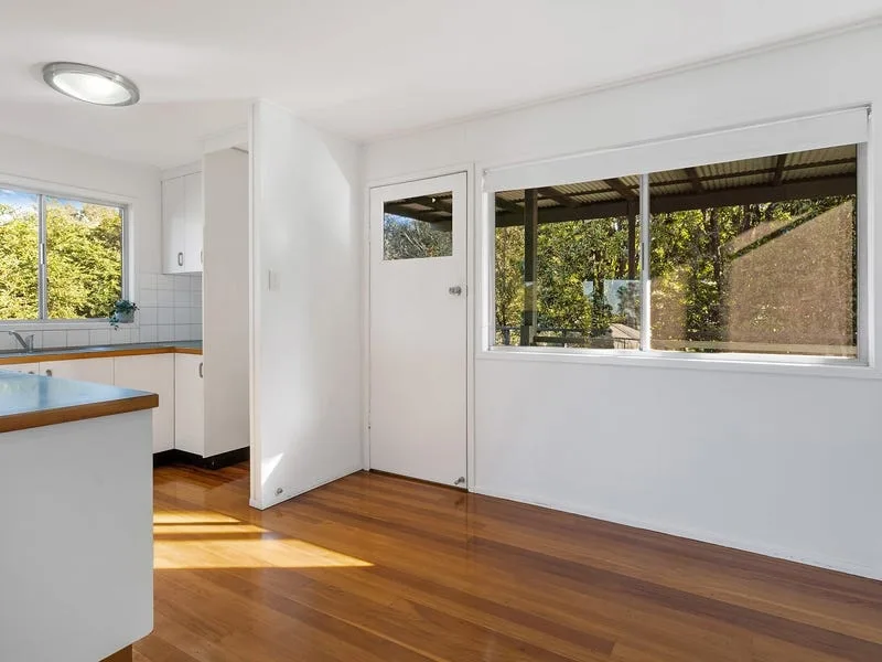 Gorgeous timber floorboards flow throughout the home and the light-filled interior of the living areas are welcoming. The kitchen is open plan and well-equipped with leafy views.