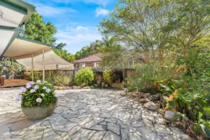 lovely rear outdoor area surrounded by greenery, this home