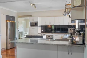 The upper floor flows fluidly through the living, family and dining rooms, which are connected by a central kitchen with an open design framed by wraparound benchtops, an island bench, stainless steel appliances and extensive cabinetry.