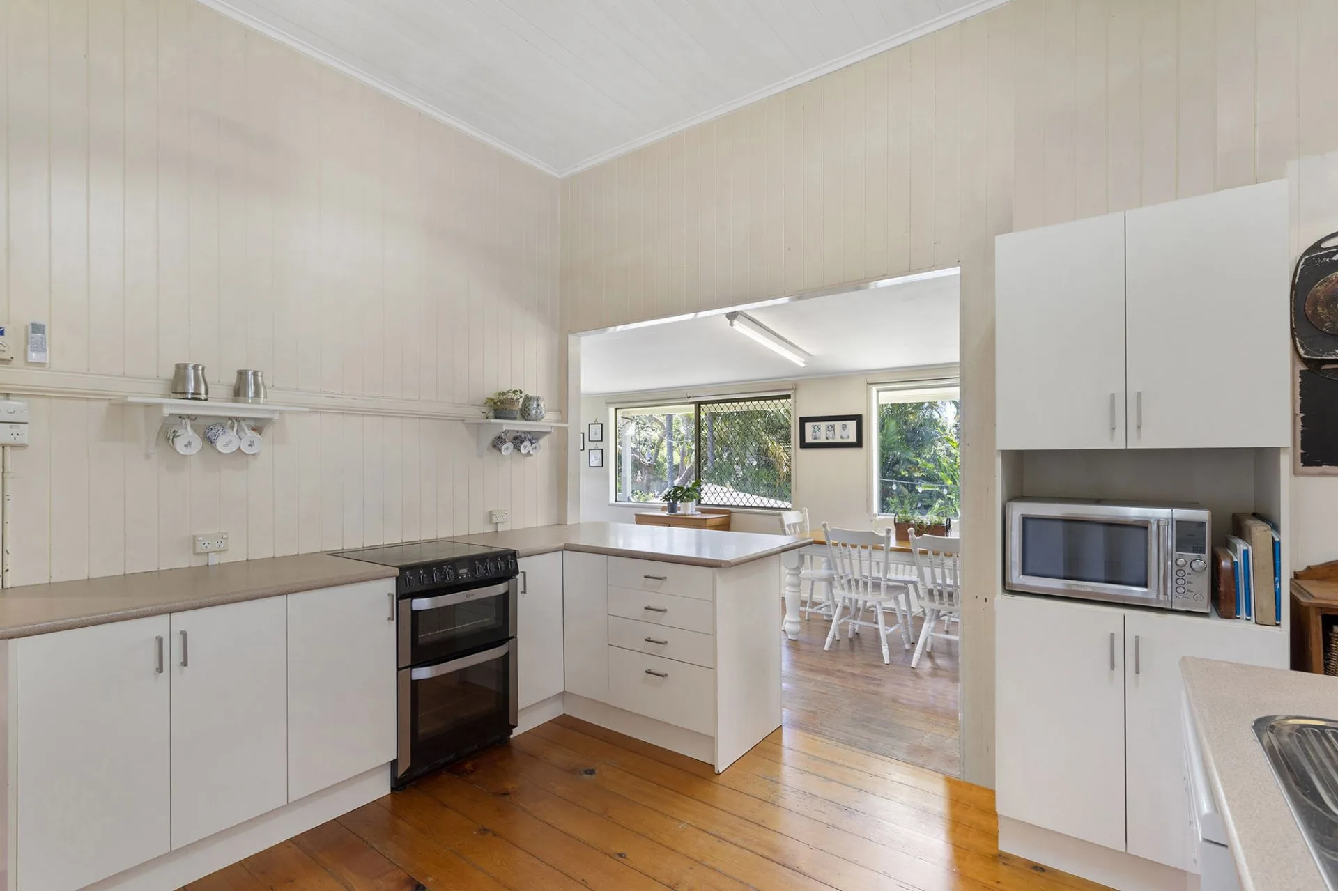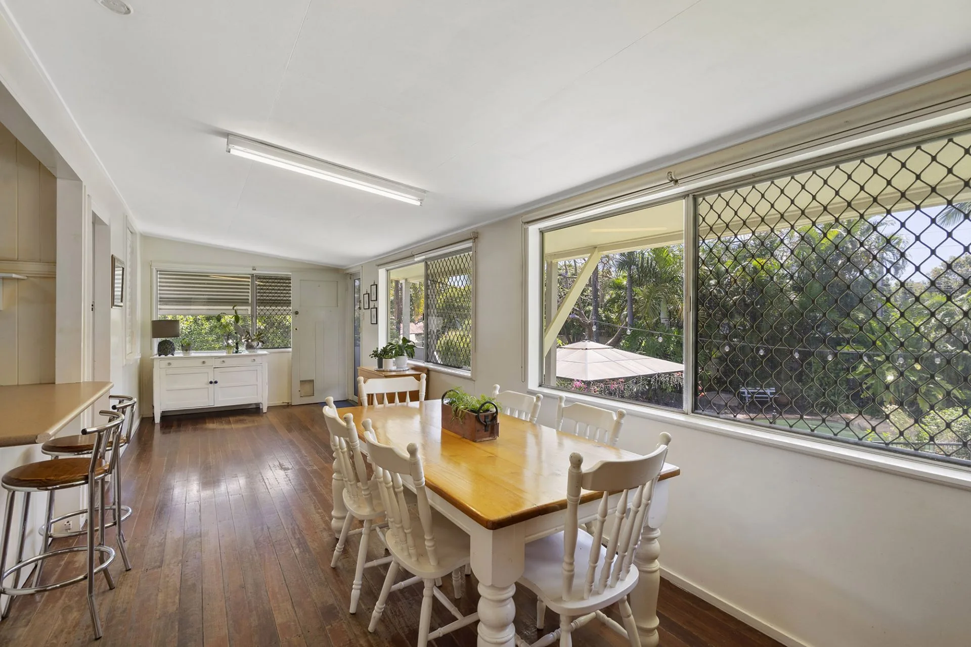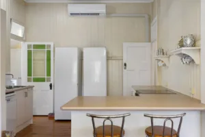 Accessed via a grand front staircase and ornate front door, from the outset you are welcomed into the main living area, featuring traditional design elements including decorative breezeways, VJ walls, high ceilings and timber floors. The spacious kitchen incorporates a breakfast bar, ample bench space, split system air-conditioning and a large walk-in pantry. Located off the kitchen, the secondary living/dining area frames the rear yard and pool through large sliding windows.