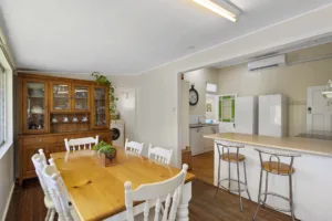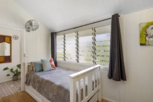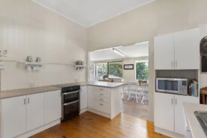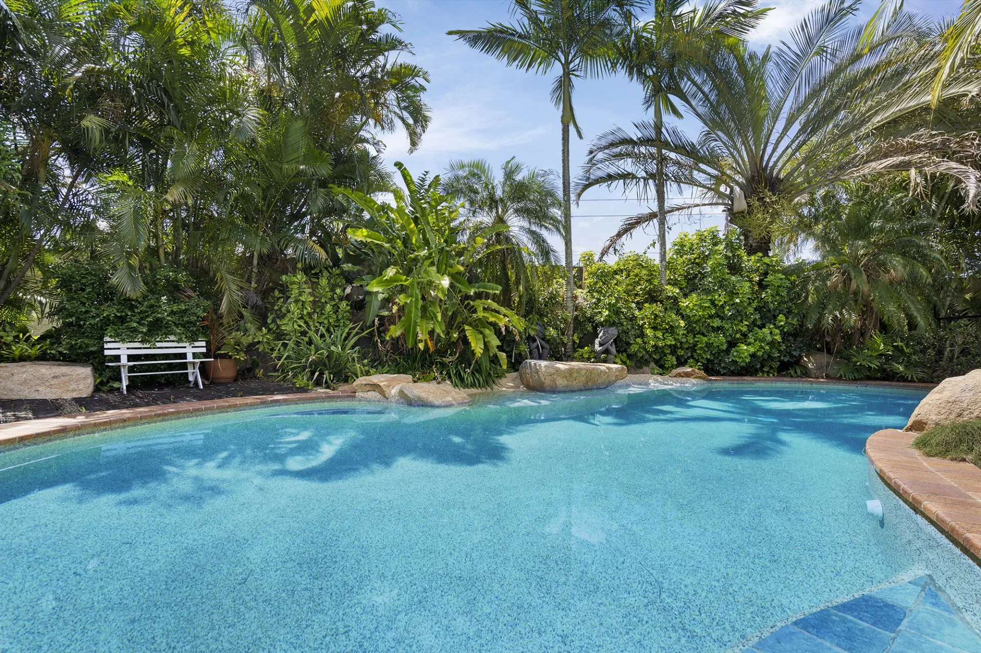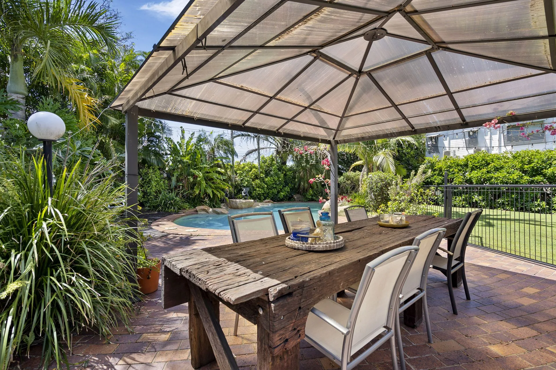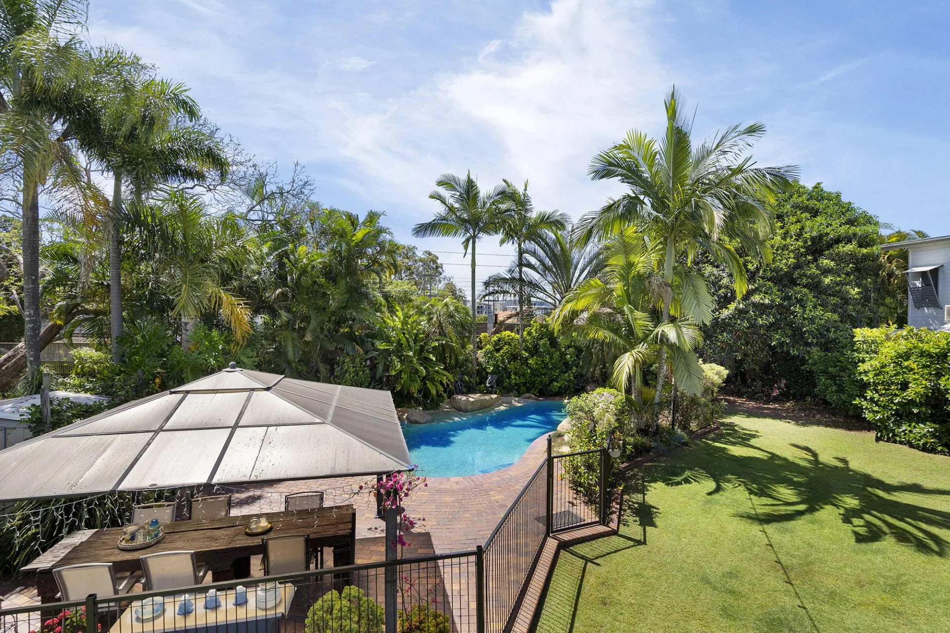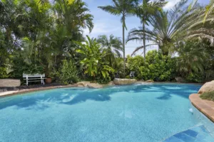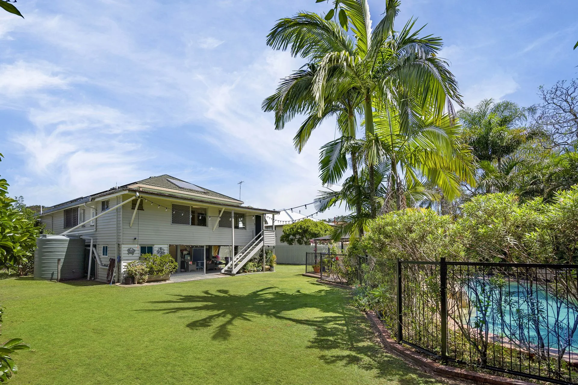 The expansive rear yard creates a private tropical paradise with a sparkling inground pool surrounded by tall palms trees and a covered pergola, perfect for al fresco entertaining or enjoying the beautiful summer climate. The property also includes an additional study off the main living area, water tanks, solar panels, internal laundry, split-system air-conditioning, ceiling fans and two-car carport, with the added benefit of ample under-house storage and separate powder room – perfect for the kids as they hop out of the pool.