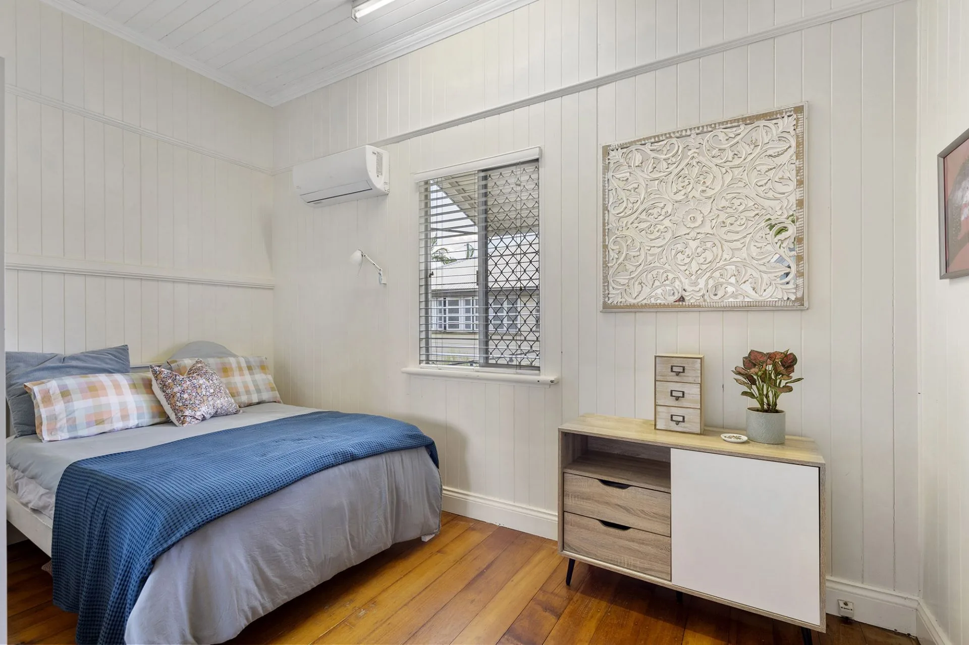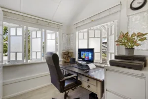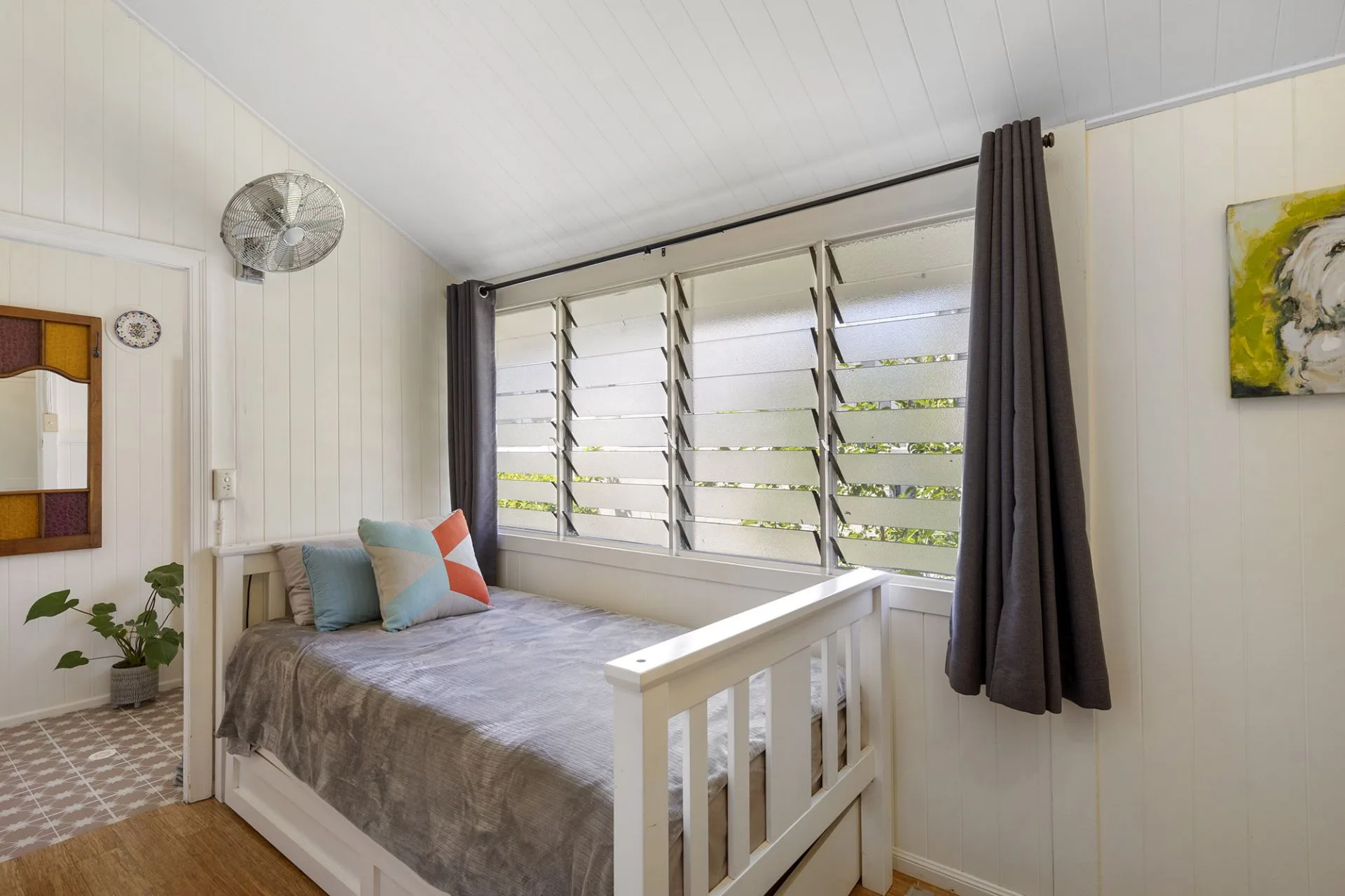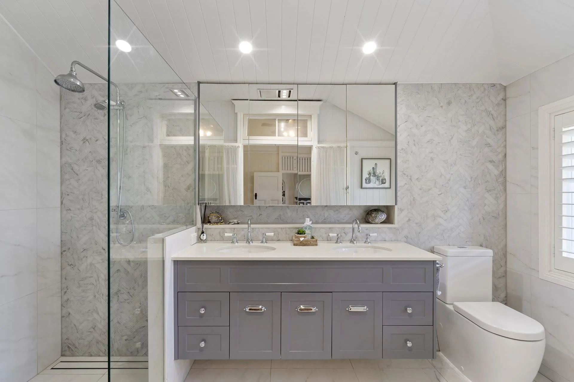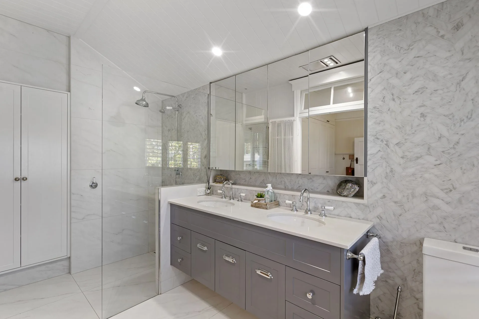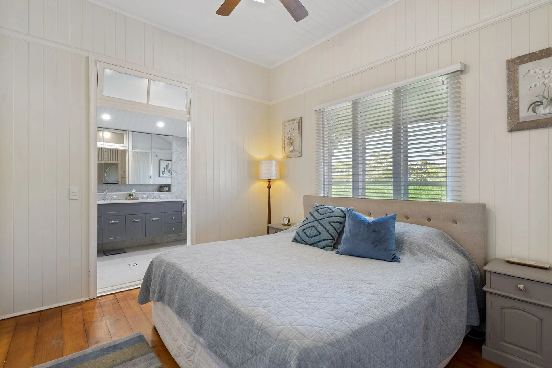 The master suite contains extensive floor-to-ceiling built-in wardrobes and a luxurious recently renovated ensuite, with a wall of herringbone tiles, double mirrored vanity, storage and an oversized walk-in shower. The second bedroom enjoys the benefit of an adjoining sunroom, ceiling fan, decorative breezeway and access to the main bathroom with separate toilet, while the third bedroom hosts built-in wardrobes, ceiling fan and near new air-conditioning.