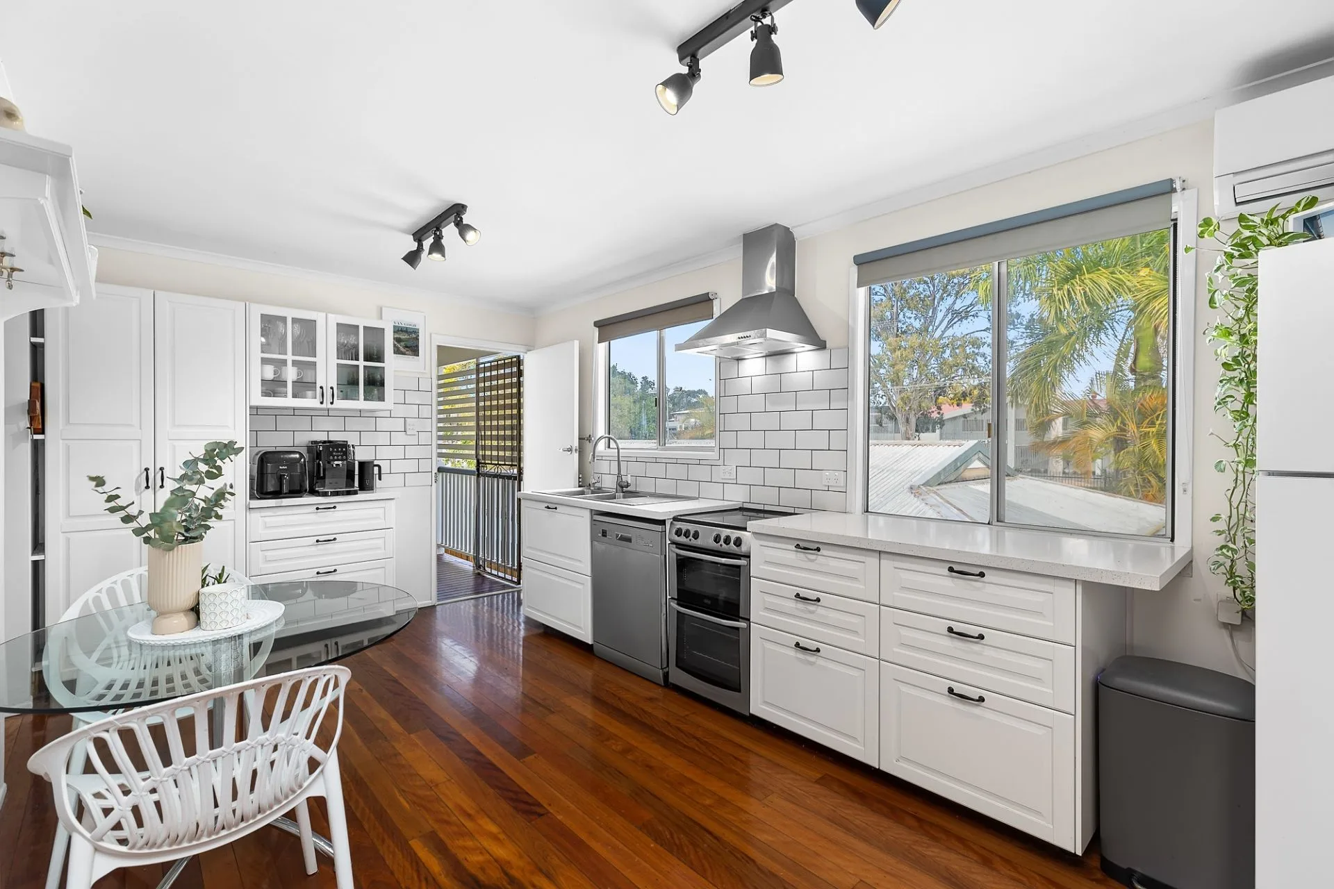 Beyond the secluded frontage, the upper level features an open living/dining area with polished timber floors and air-conditioning. The modern kitchen captures leafy outlooks and is equipped with an electric cooktop and oven, dishwasher and eat-in meals space.