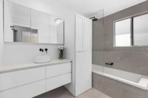 There are three bedrooms, two of which have built-in wardrobes and the main bedroom has air-conditioning. There is a modern main bathroom with floor-to-ceiling tiles and a shower over bath nearby, plus a separate powder room.
