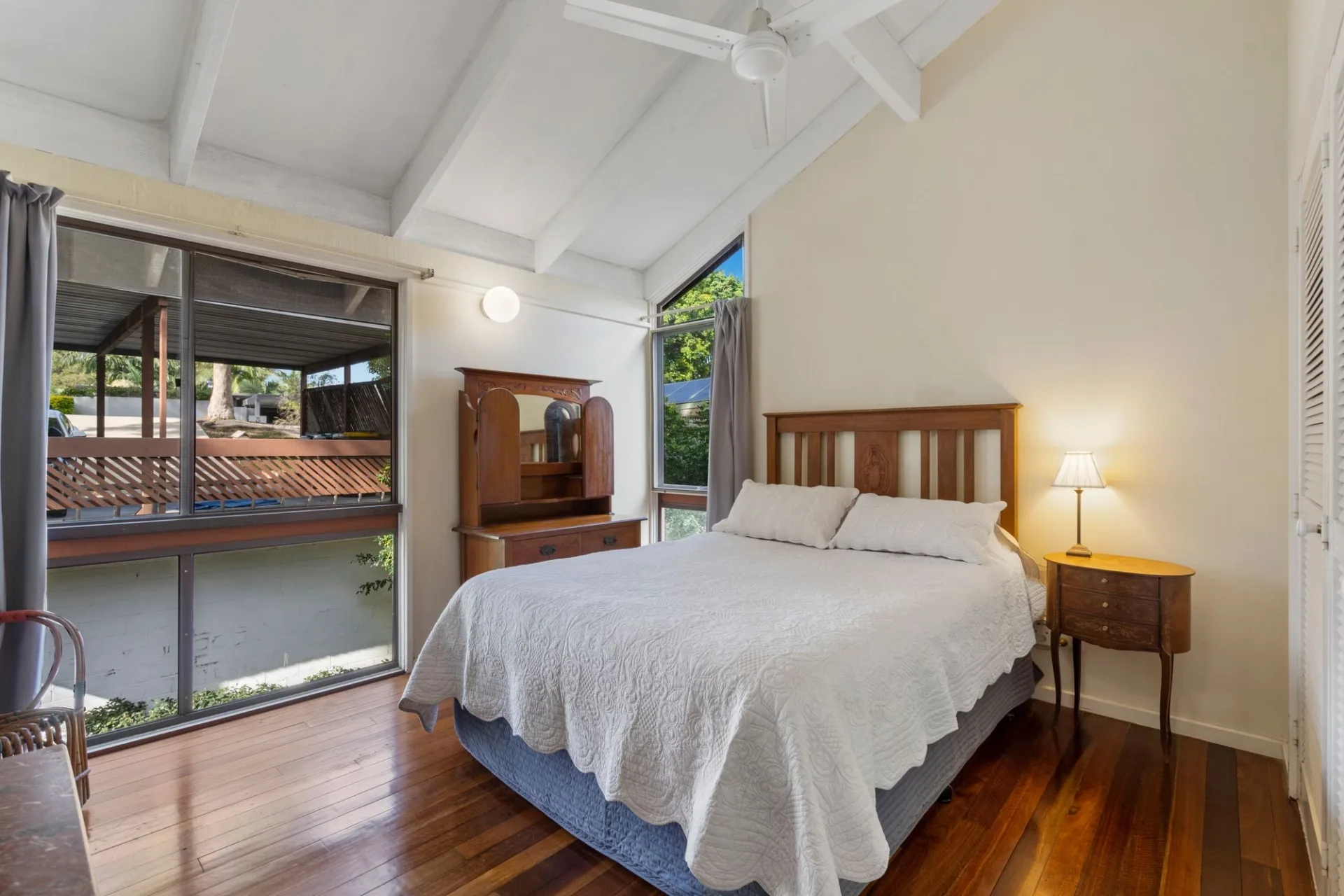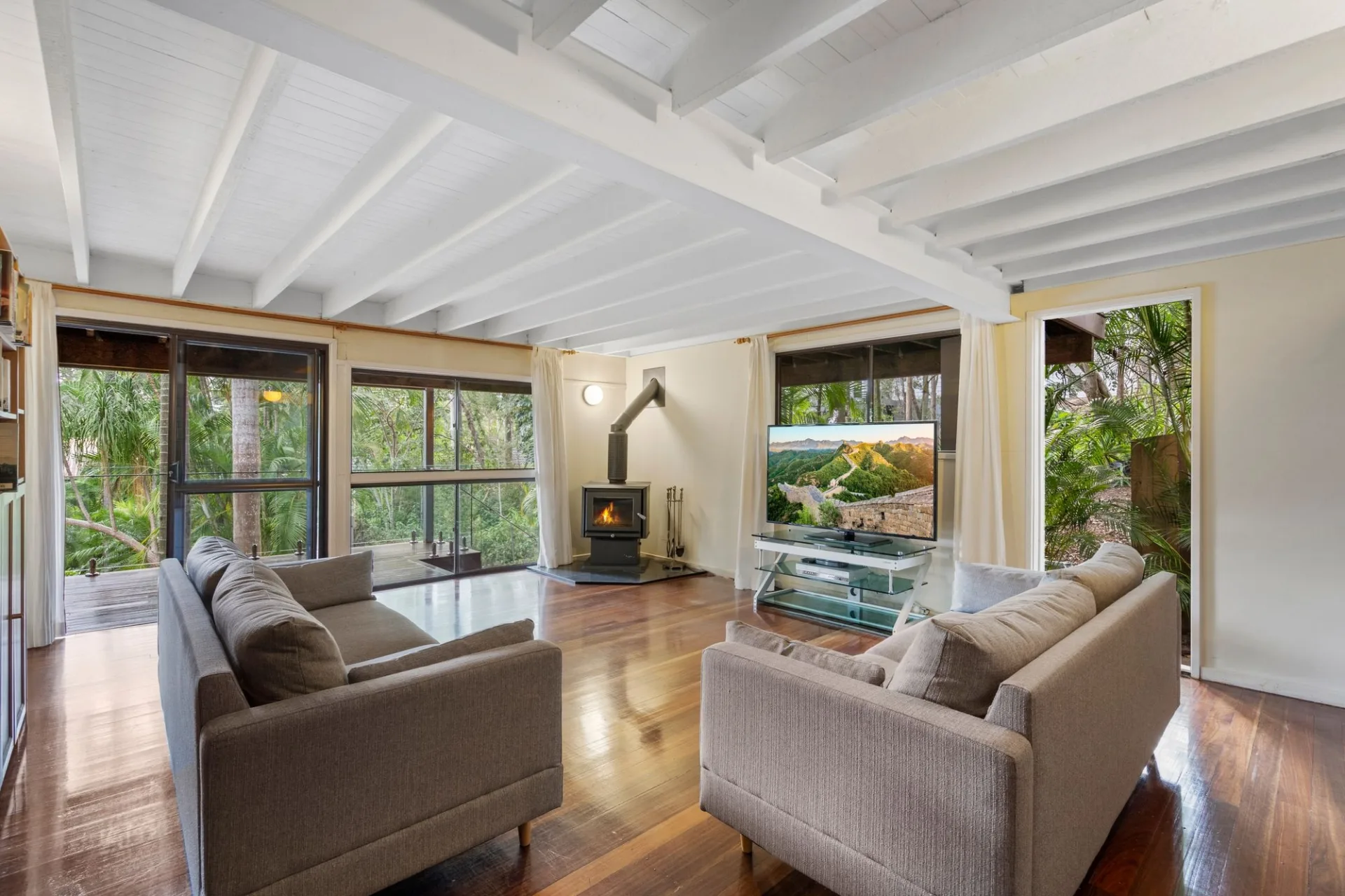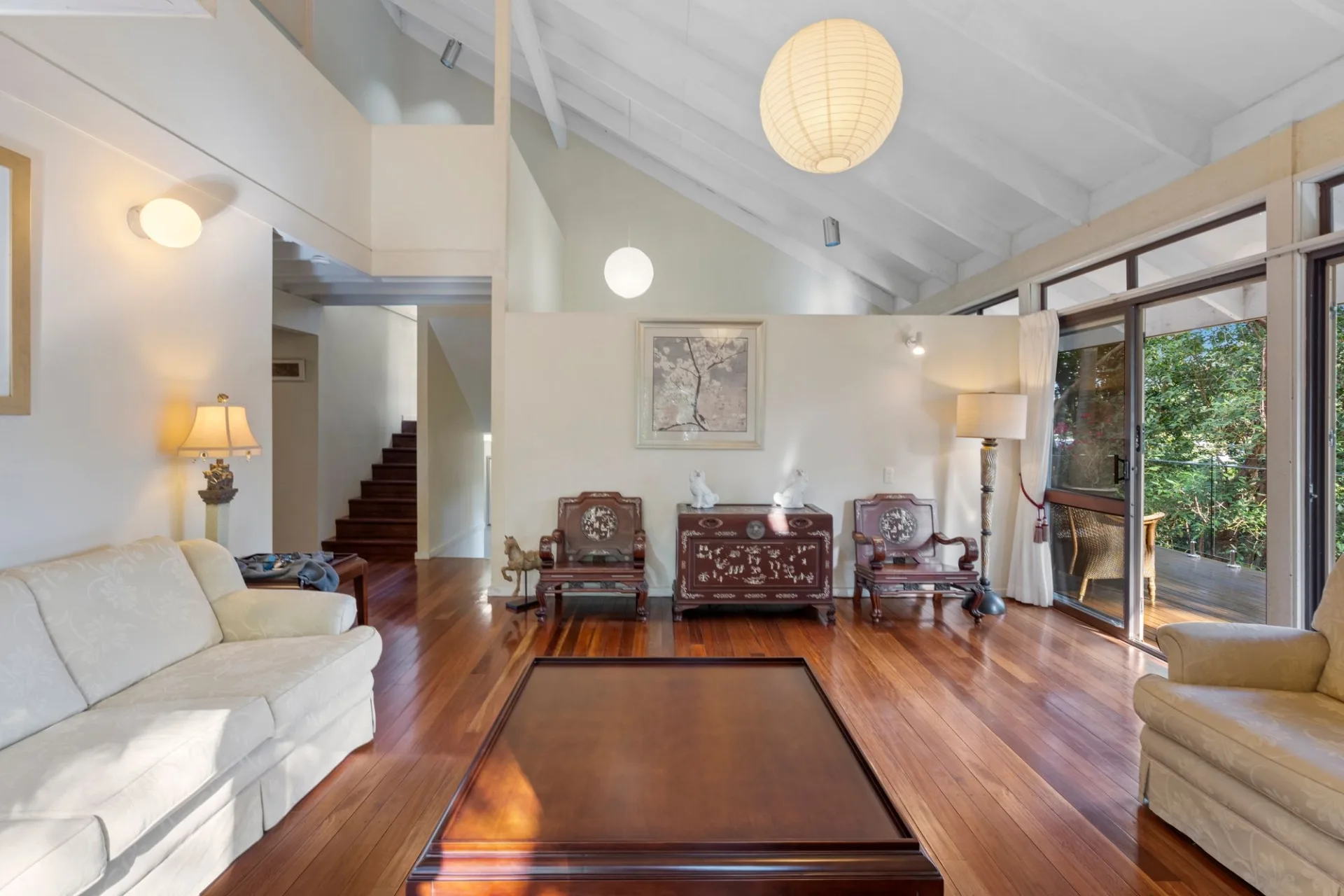 You are welcomed through the front gate and paved steps that lead down the terraced gardens to the ground floor of the home. This level comprises a formal dining room that opens out onto the front terrace, fourth bedroom with built-in wardrobe (ideal as guest room or study) and bathroom with floor-to-ceiling tiles, large walk-in glass shower and mirrored vanity. The central hallway opens out to the living and dining areas, flaunting polished timber floors, high rake ceilings and an abundance or natural light and breezes through the ample windows and doors. The wrap-around deck can be accessed from the living through three sets of sliding glass doors, perfectly framing the natural greenery and overlooking the pool.