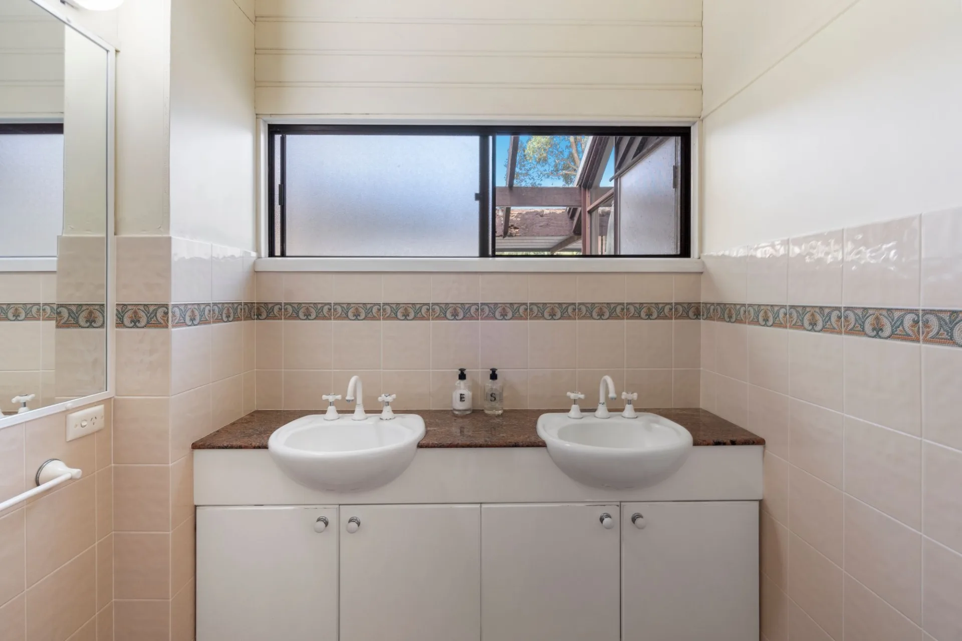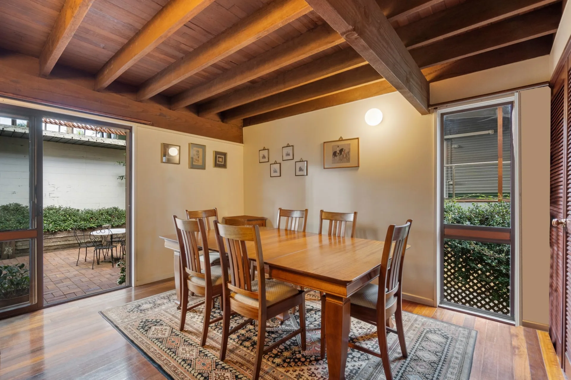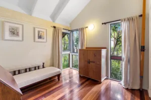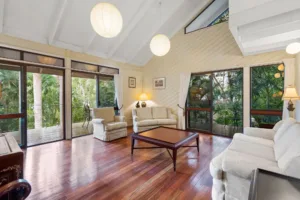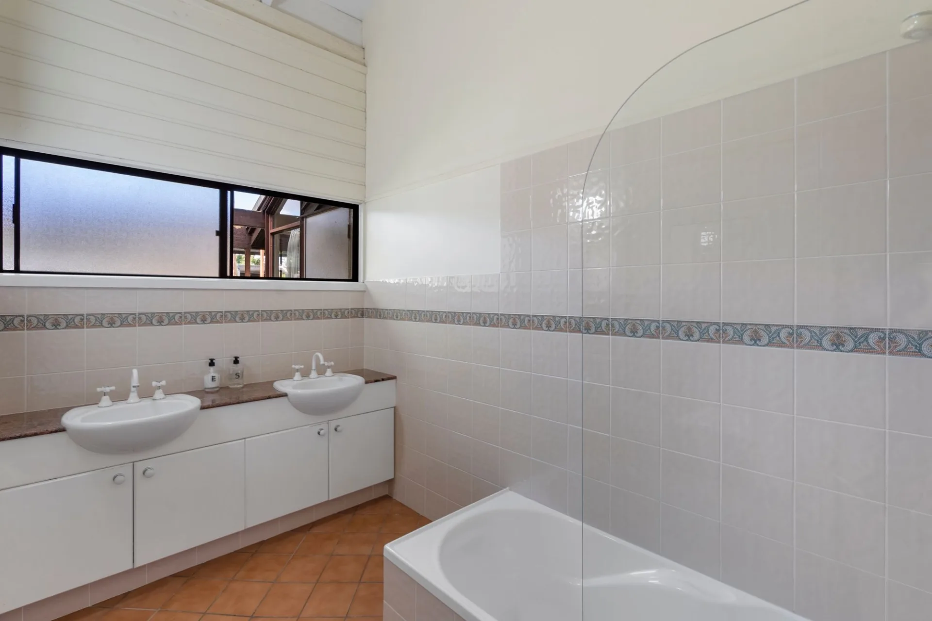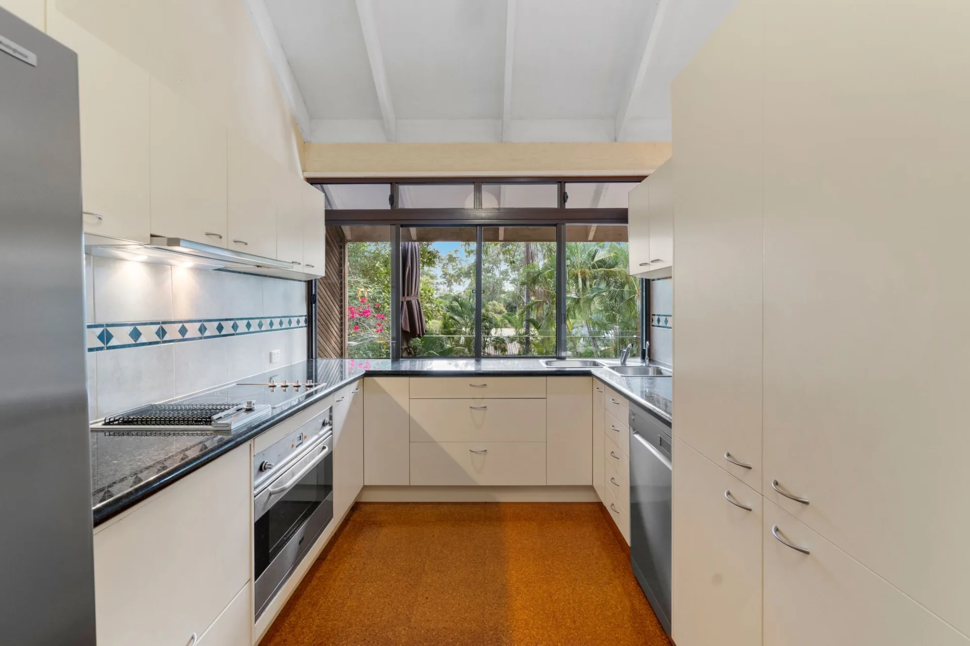You are welcomed through the front gate and paved steps that lead down the terraced gardens to the ground floor of the home. This level comprises a formal dining room that opens out onto the front terrace, fourth bedroom with built-in wardrobe (ideal as guest room or study) and bathroom with floor-to-ceiling tiles, large walk-in glass shower and mirrored vanity. The central hallway opens out to the living and dining areas, flaunting polished timber floors, high rake ceilings and an abundance or natural light and breezes through the ample windows and doors. The wrap-around deck can be accessed from the living through three sets of sliding glass doors, perfectly framing the natural greenery and overlooking the pool.