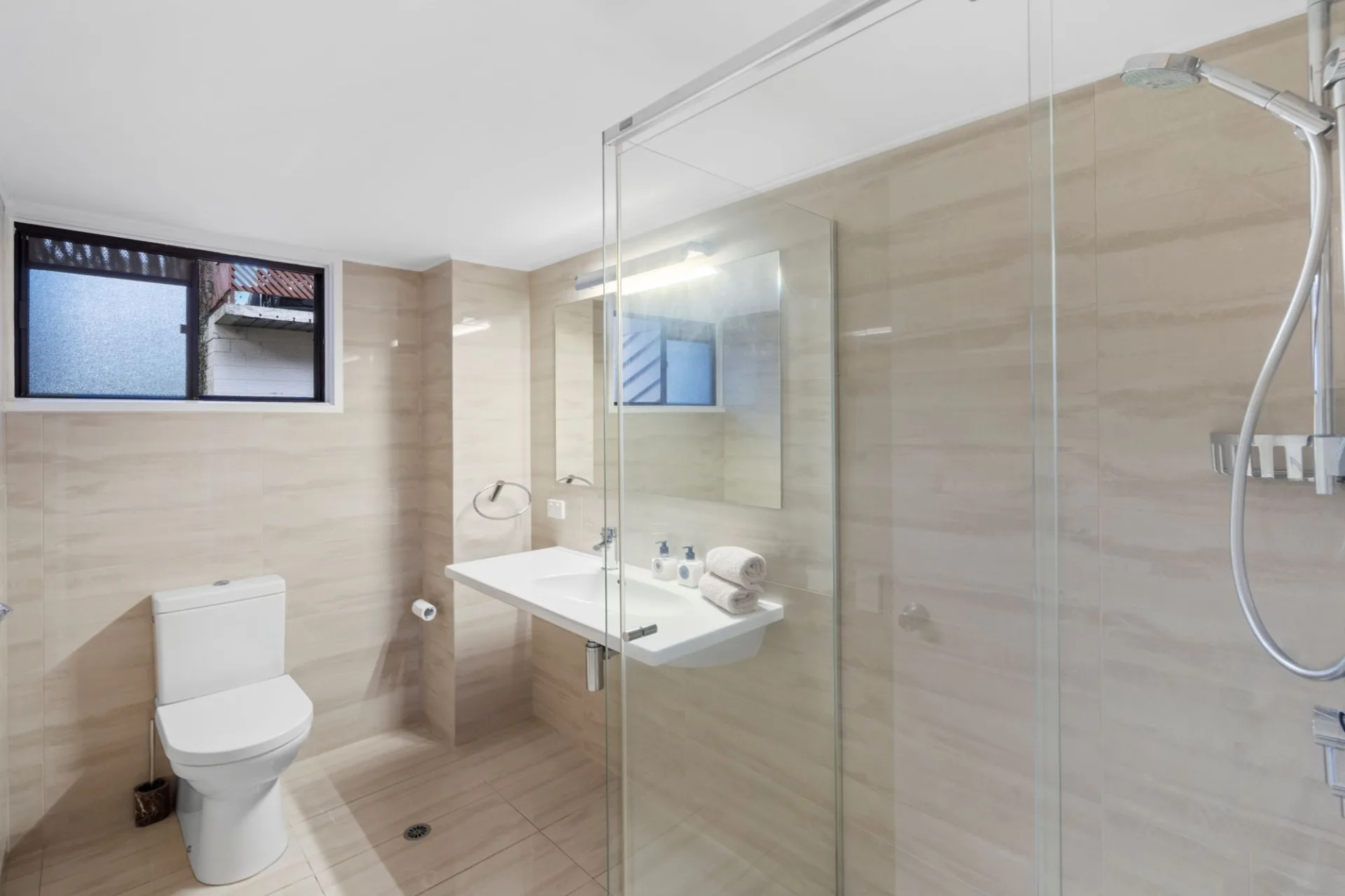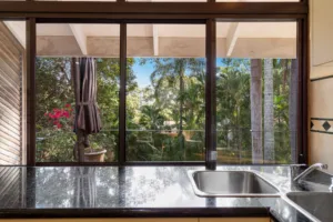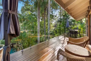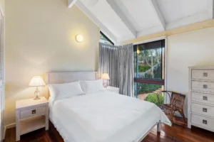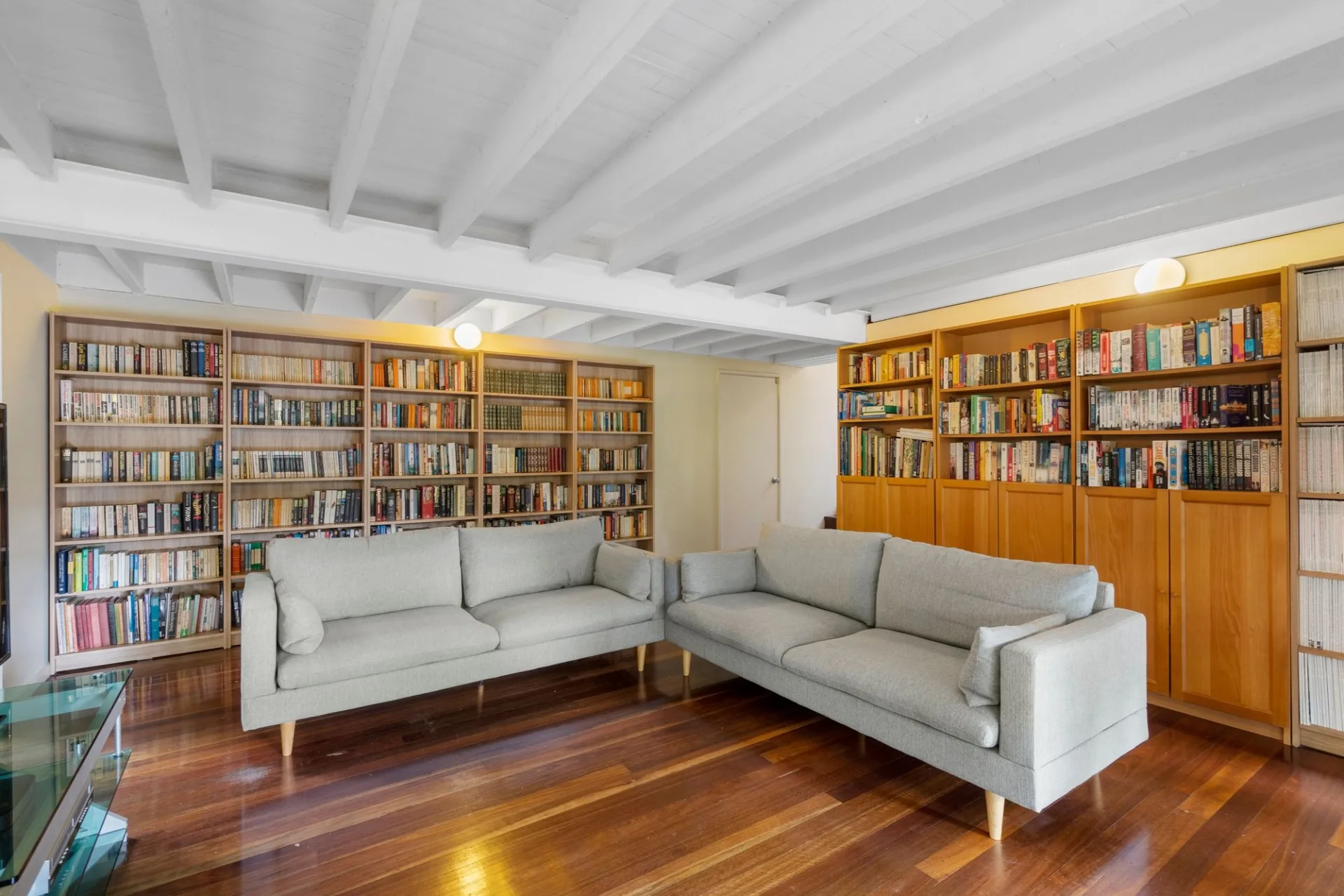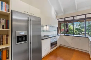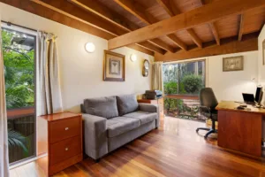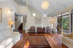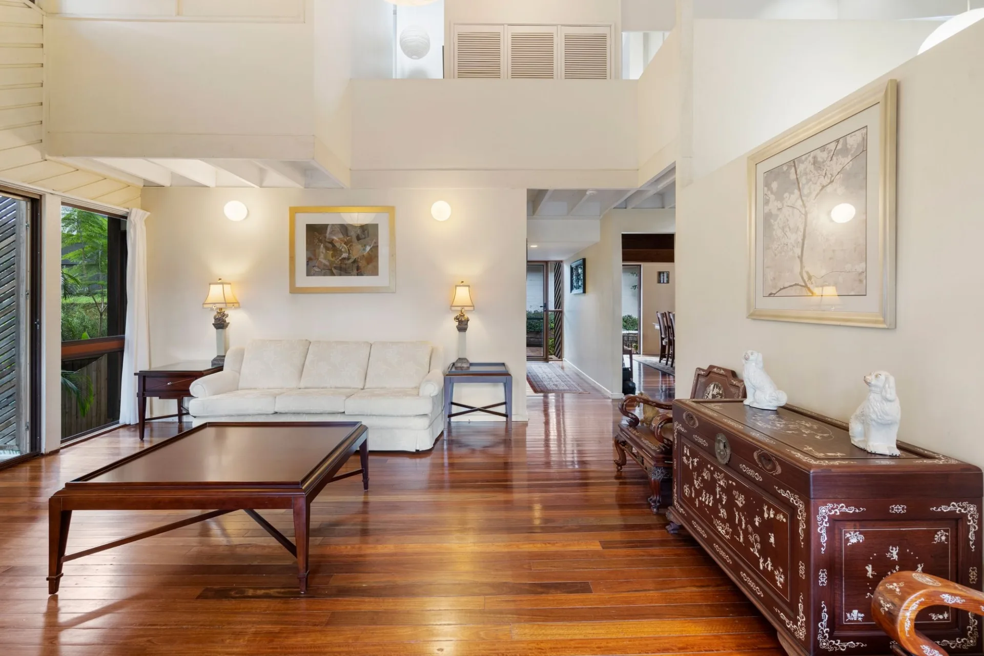 You are welcomed through the front gate and paved steps that lead down the terraced gardens to the ground floor of the home. This level comprises a formal dining room that opens out onto the front terrace, fourth bedroom with built-in wardrobe (ideal as guest room or study) and bathroom with floor-to-ceiling tiles, large walk-in glass shower and mirrored vanity. The central hallway opens out to the living and dining areas, flaunting polished timber floors, high rake ceilings and an abundance or natural light and breezes through the ample windows and doors. The wrap-around deck can be accessed from the living through three sets of sliding glass doors, perfectly framing the natural greenery and overlooking the pool.