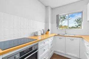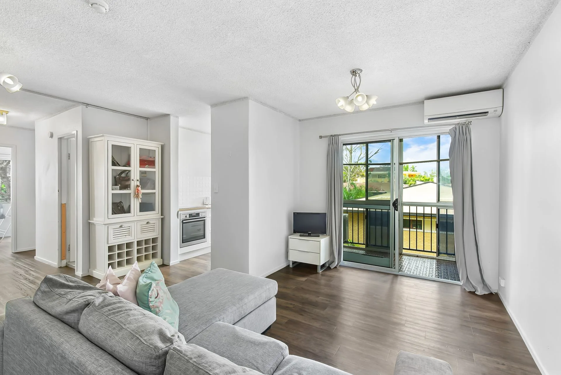 Soft natural light floods the two-bedroom, one-bathroom layout with on-trend vinyl flooring, muted colour tones and an open-plan design enhancing the contemporary appeal. The open-plan lounge and dining room is spacious and air-conditioned with direct access to the kitchen and out to the covered balcony with lovely views.