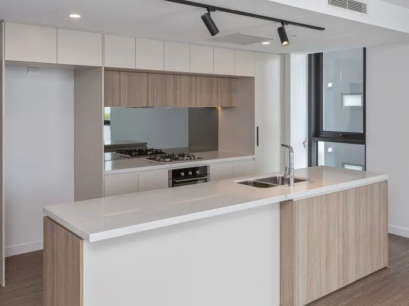 The lounge, dining and kitchen divide the bedrooms and bathrooms, providing well-separated living quarters within a functional floorplan. The apartments displays quality high-end finishes, incorporating timber floorboards, Quartz stone benchtops and wood-finish cabinetry throughout. The European-style kitchen features a mirrored splashback, gas cooking, soft-close cabinetry and sleek appliances, the kitchen, dining, living and balcony with City views flowing together for seamless entertaining opportunities.