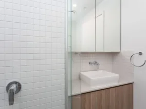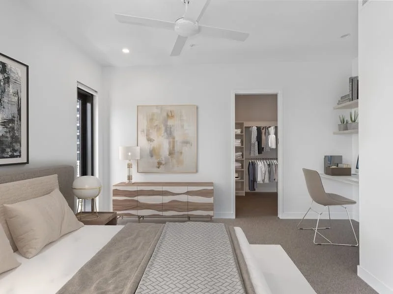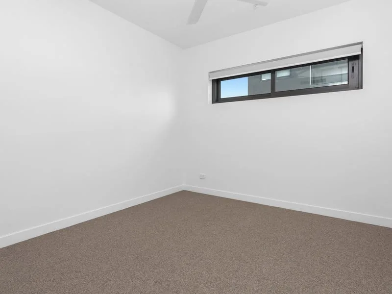 The master bedroom offers direct balcony access, built-in study nook, sizable walk-in wardrobe and ensuite with walk-in shower, mirrored vanity and toilet. The second bedroom hosts a double mirrored built-in wardrobe and 2 way access to the main bathroom, containing a substantial glass shower, toilet and mirrored vanity with floating sink. The property also features an internal laundry, fully ducted air-conditioning, and ceiling fans, plus a single car space in the secure basement carpark.
