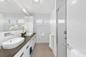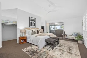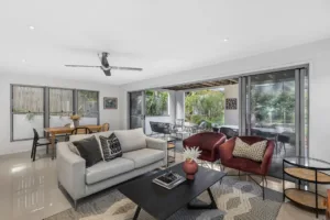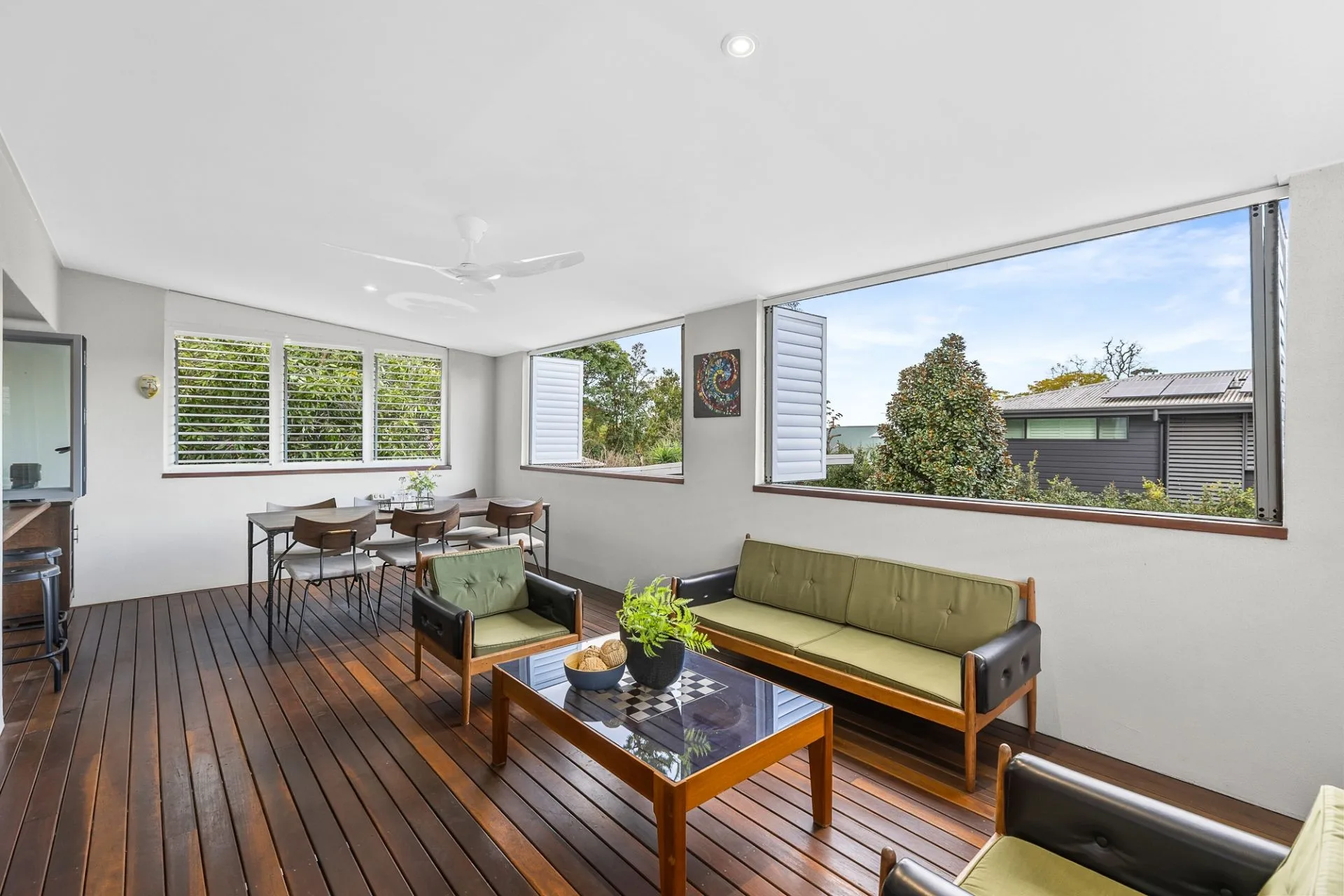 Adorned with polished floors and plantation shutters, the open plan living and dining area takes centre stage across the main living level alongside a modern kitchen equipped with a waterfall stone island bench and a servery window to the enclosable rear deck. Blurring the lines between indoor and outdoor living and offering all-weather enjoyment, the deck is destined for gatherings, dinners and parties with friends.