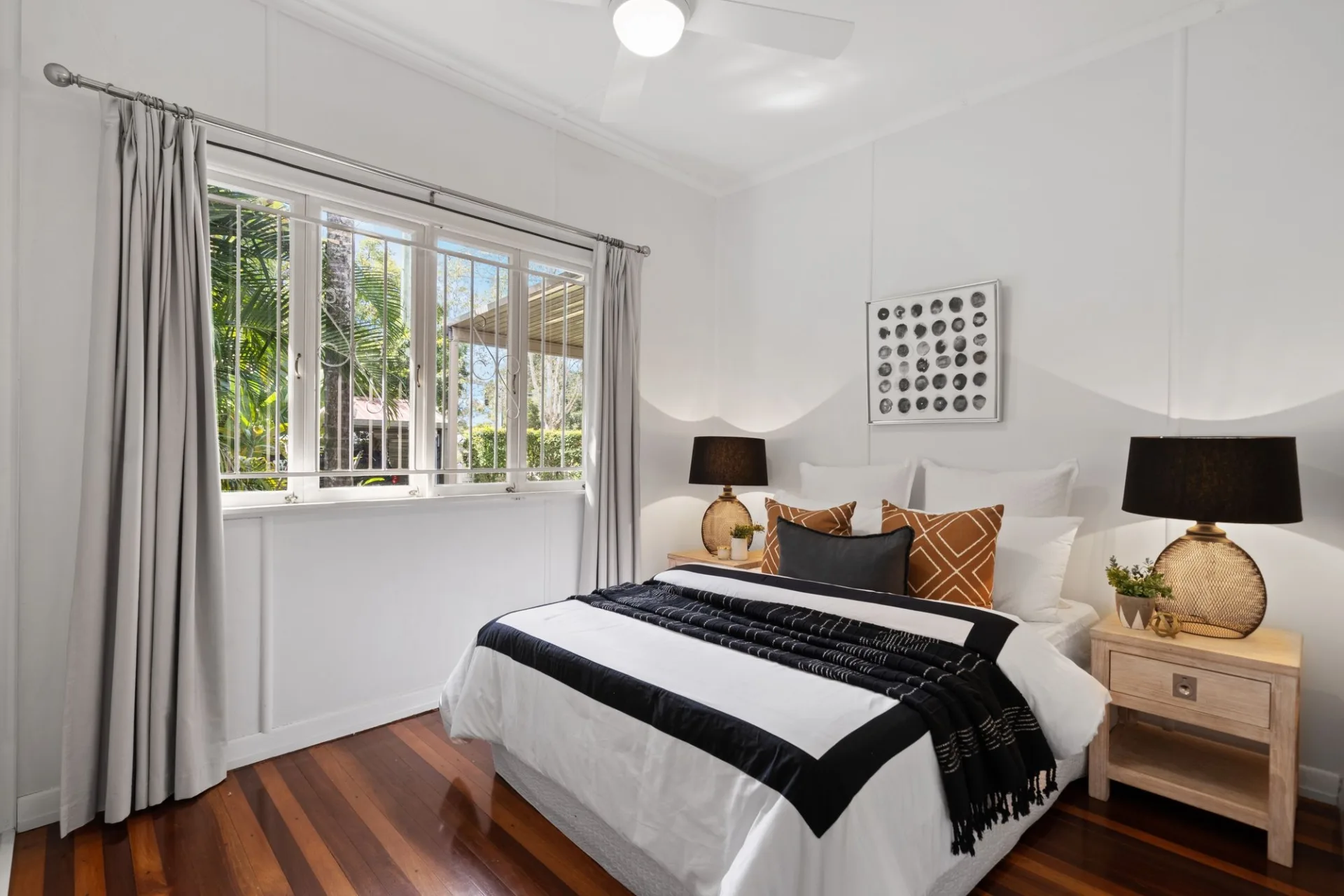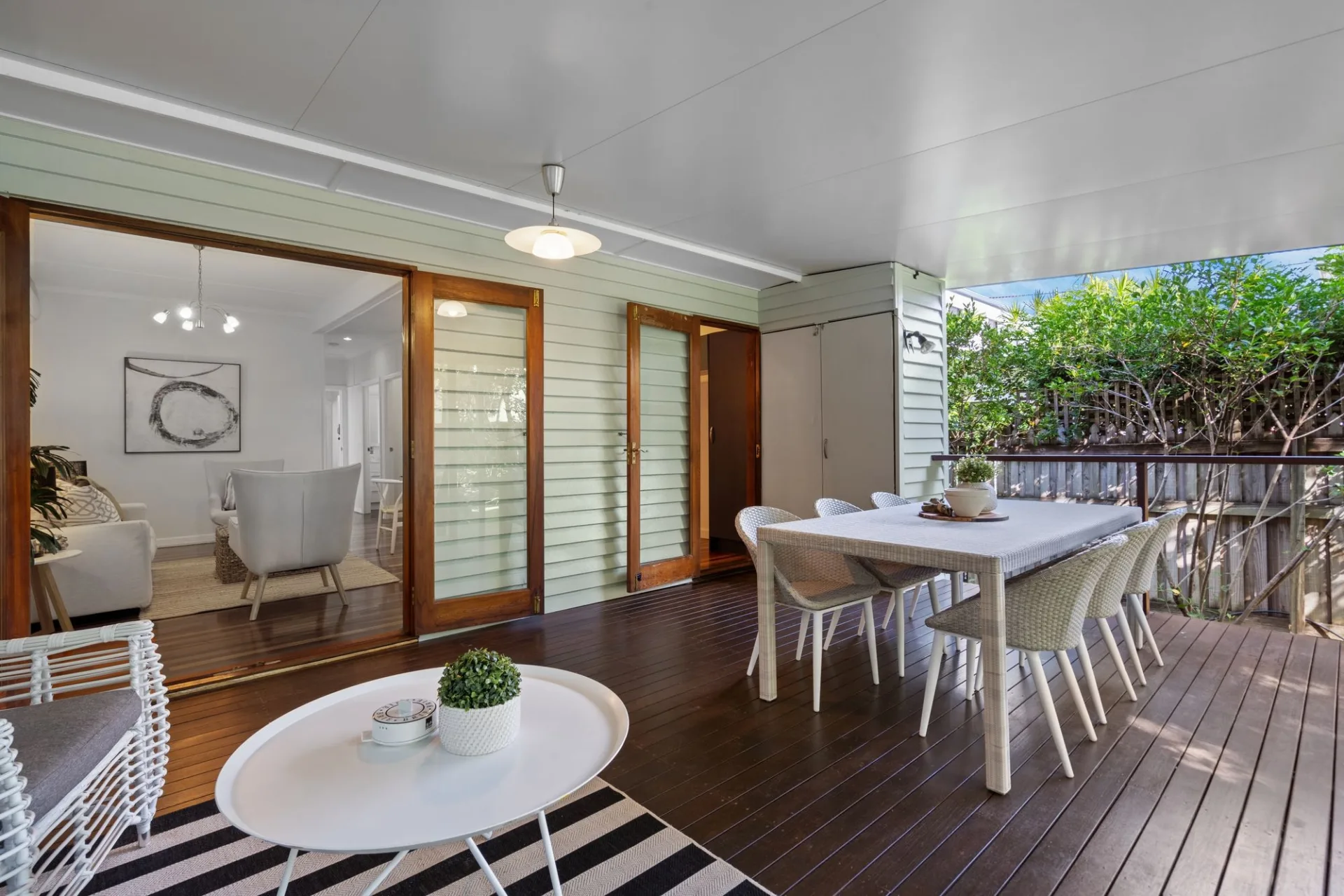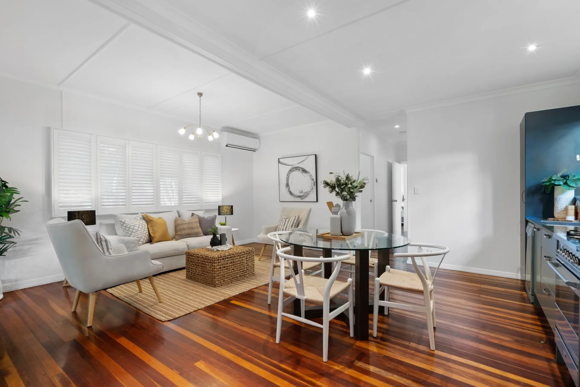 Cute and quaint from the outset, the Queenslander cottage is set back from the street and privatised through low-maintenance gardens. Entering via the porch, the front section of the home is occupied by the three light-filled bedrooms complete with casement windows, two featuring built-in wardrobes, two with ceiling fans and the main with air-conditioning. The bathroom is positioned at the end of the hallway to the bedrooms, comprising a walk-in shower, mirrored vanity and separate powder room. The central hallway flows out to the open-plan living areas, flaunting high ceilings, polished timber floors and windows with white plantation shutters.