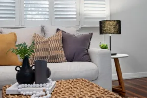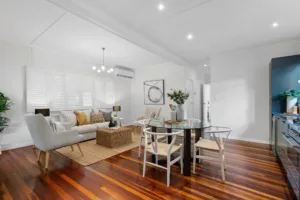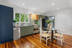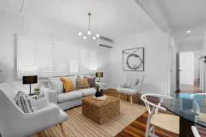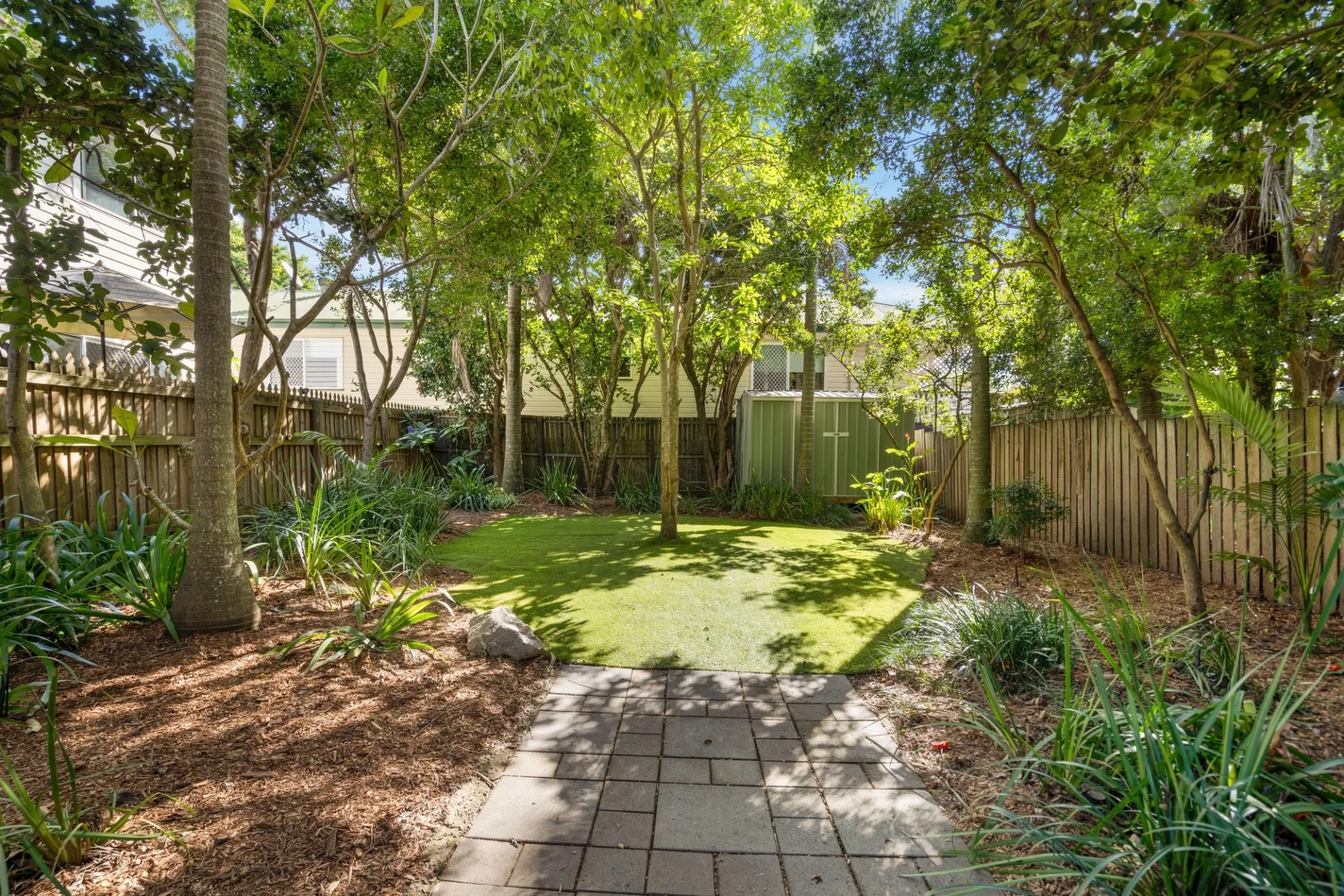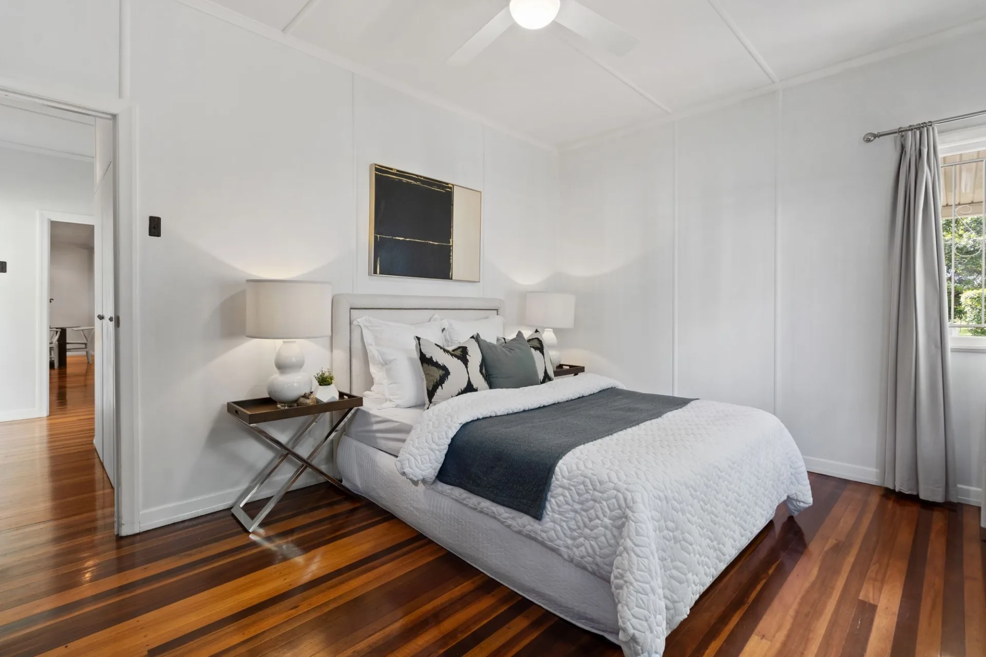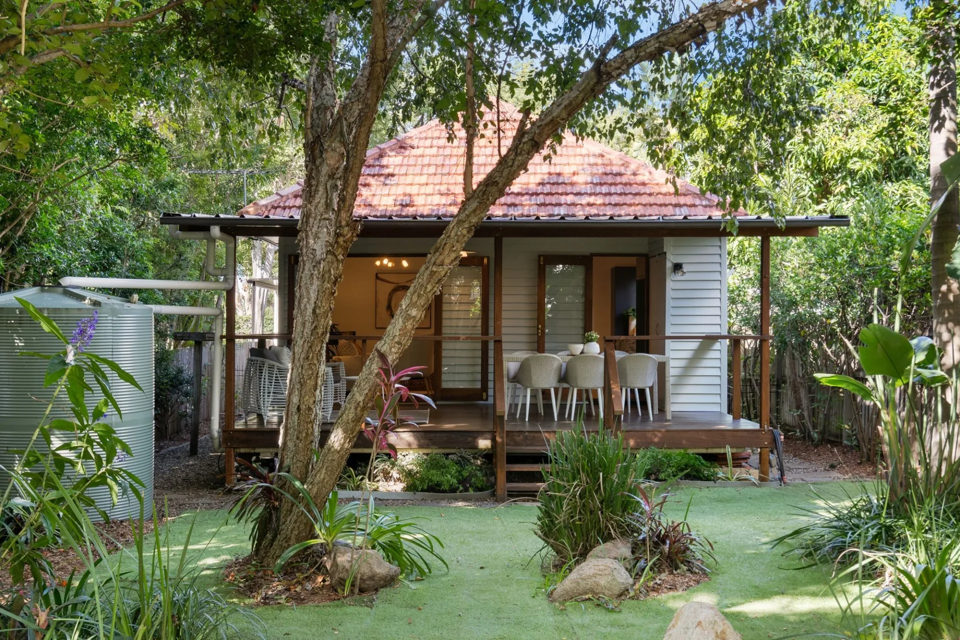 Cute and quaint from the outset, the Queenslander cottage is set back from the street and privatised through low-maintenance gardens. Entering via the porch, the front section of the home is occupied by the three light-filled bedrooms complete with casement windows, two featuring built-in wardrobes, two with ceiling fans and the main with air-conditioning. The bathroom is positioned at the end of the hallway to the bedrooms, comprising a walk-in shower, mirrored vanity and separate powder room. The central hallway flows out to the open-plan living areas, flaunting high ceilings, polished timber floors and windows with white plantation shutters.