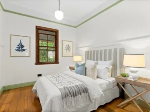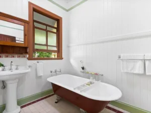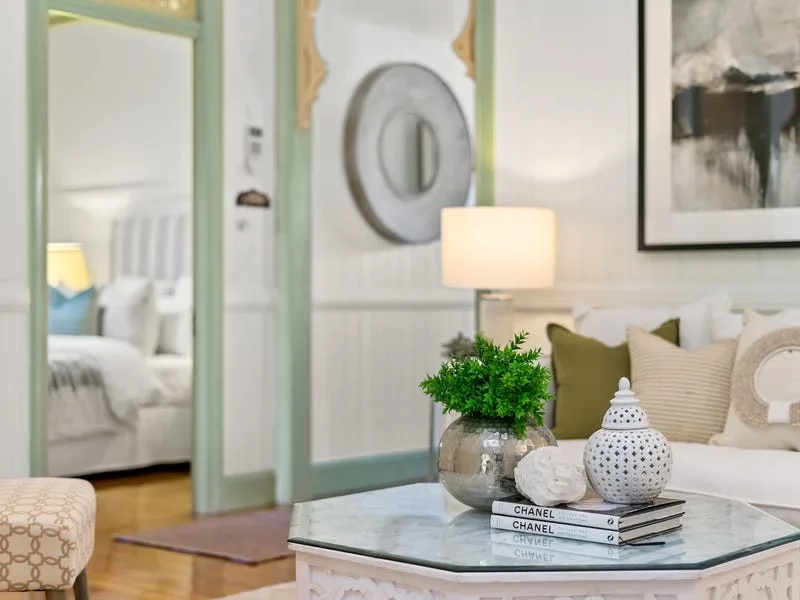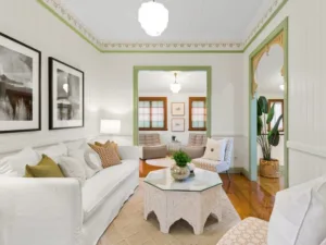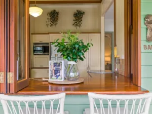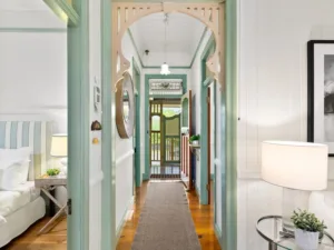 The classic design and layout enables calming breezes to flow through the home for year round comfort. The hallway opens out to the lounge, dining and sitting rooms, with intricate hand-stencilled frieze and vintage pendant lighting, just a few of the many classic attributes that have been charmingly restored.