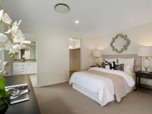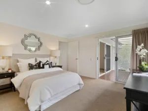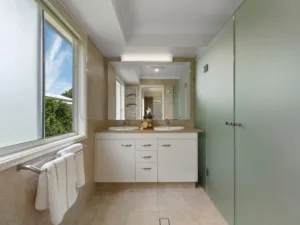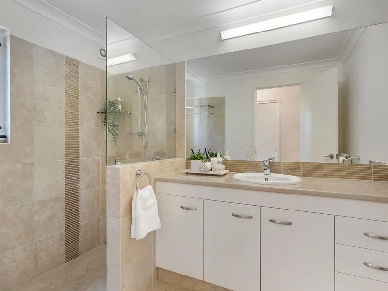 The luxe residence contains five bedrooms; one on the lower level that could also be utilised as a study or home office and the other four including the master suite upstairs. Two of the bedrooms feature elegant bay windows, four with built-in wardrobes and the master with a spacious walk-in-wardrobe and opulent ensuite. The ensuite features a dual-sink vanity, separate shower and toilet privatised by frosted glass. The master and second bedroom provide access to the timber balcony through sliding glass doors. The main bathroom upstairs is divided into three sections: a powder room, washroom, shower and bathtub, whilst the lower level hosts an equally spacious bathroom with floor-to-ceiling tiles, large walk-in shower and a separate toilet.