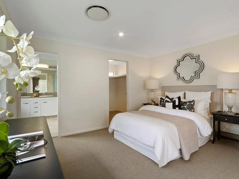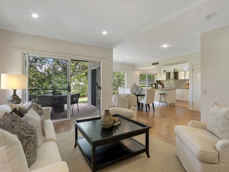 Additional features of the lavish home include Crimsafe screens, ducted air-conditioning, Bosch alarm security system, water tank and ample storage including a storage room off the double garage, multiple linen cupboards, an internal laundry with drying courtyard and a large under-stair storage area. Flowing off the lounge and dining rooms, the low-maintenance backyard and al fresco patio provide the perfect environment for dining, entertaining and relaxing, made private by the tall surrounding greenery.