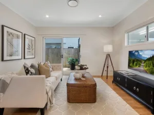 Encompassed by a white picket fence, the triple-gable home flaunts a classic grey and white exterior colour scheme complimenting the neutral interior palate. Welcoming you through the grassy front yard and porch, the grand foyer leads seamlessly through to the light filled living with ample windows and the leafy rear yard. The internal lower-level displays timber-look floors and high ceilings, comprising a loungeroom, dining, kitchen and separate media/rumpus room. The generous kitchen boasts stone benchtops, soft-close cabinetry, oversized butlers’ pantry with sensor lighting and deluxe appliances including a gourmet oven, Miele dishwasher and electric cooktop.