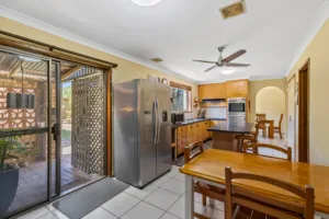 Showcasing solid construction and a spacious design in mostly original well maintained condition, the floor plan lends itself to relaxed, carefree living and provides excellent separation across multiple zones. Stepping inside, you will find yourself flowing through the living and dining spaces, kept cool with air-conditioning, and extending into the kitchen and breakfast nook, unveiling an open layout with a central island for easy meal preparation.
