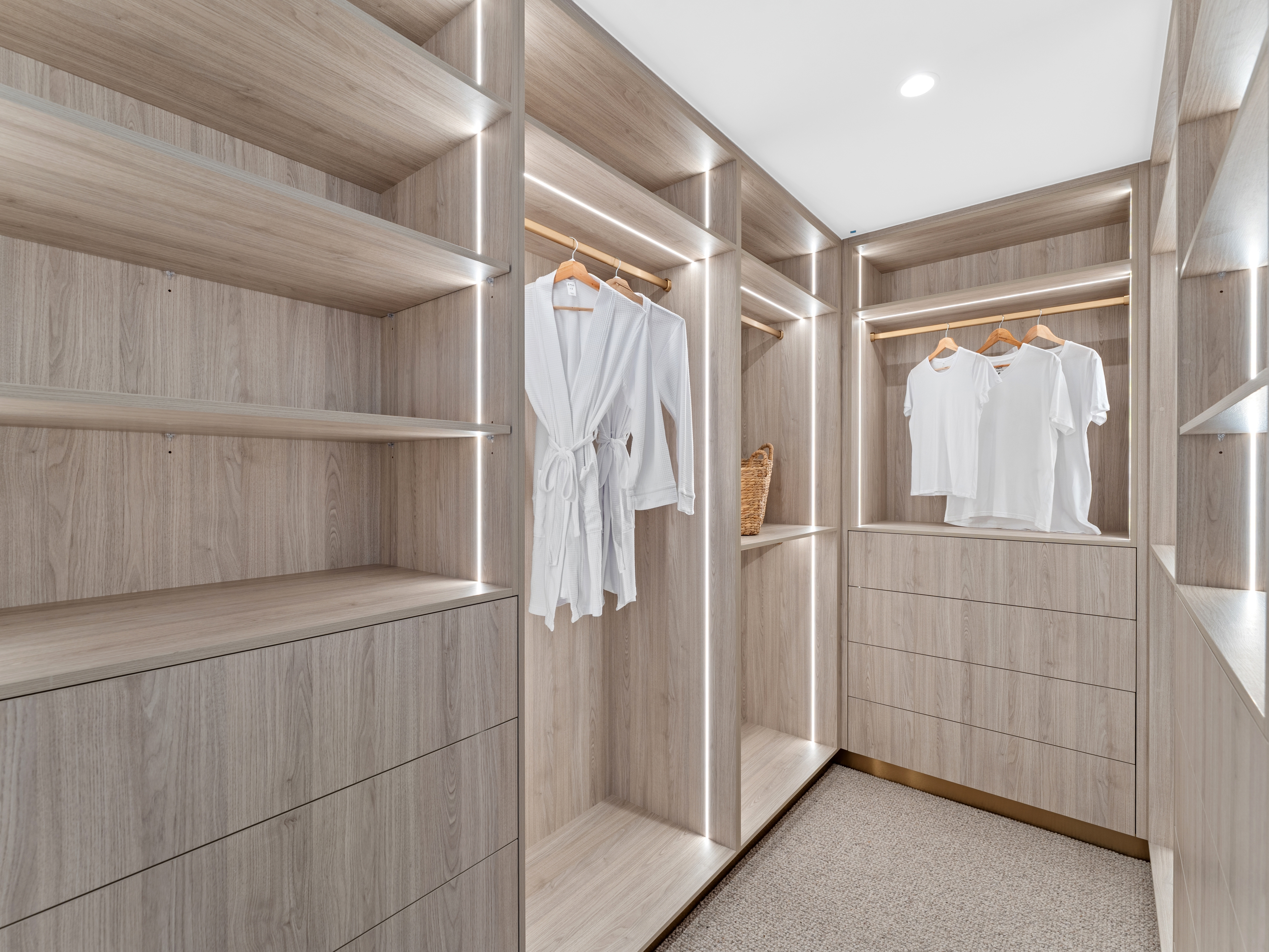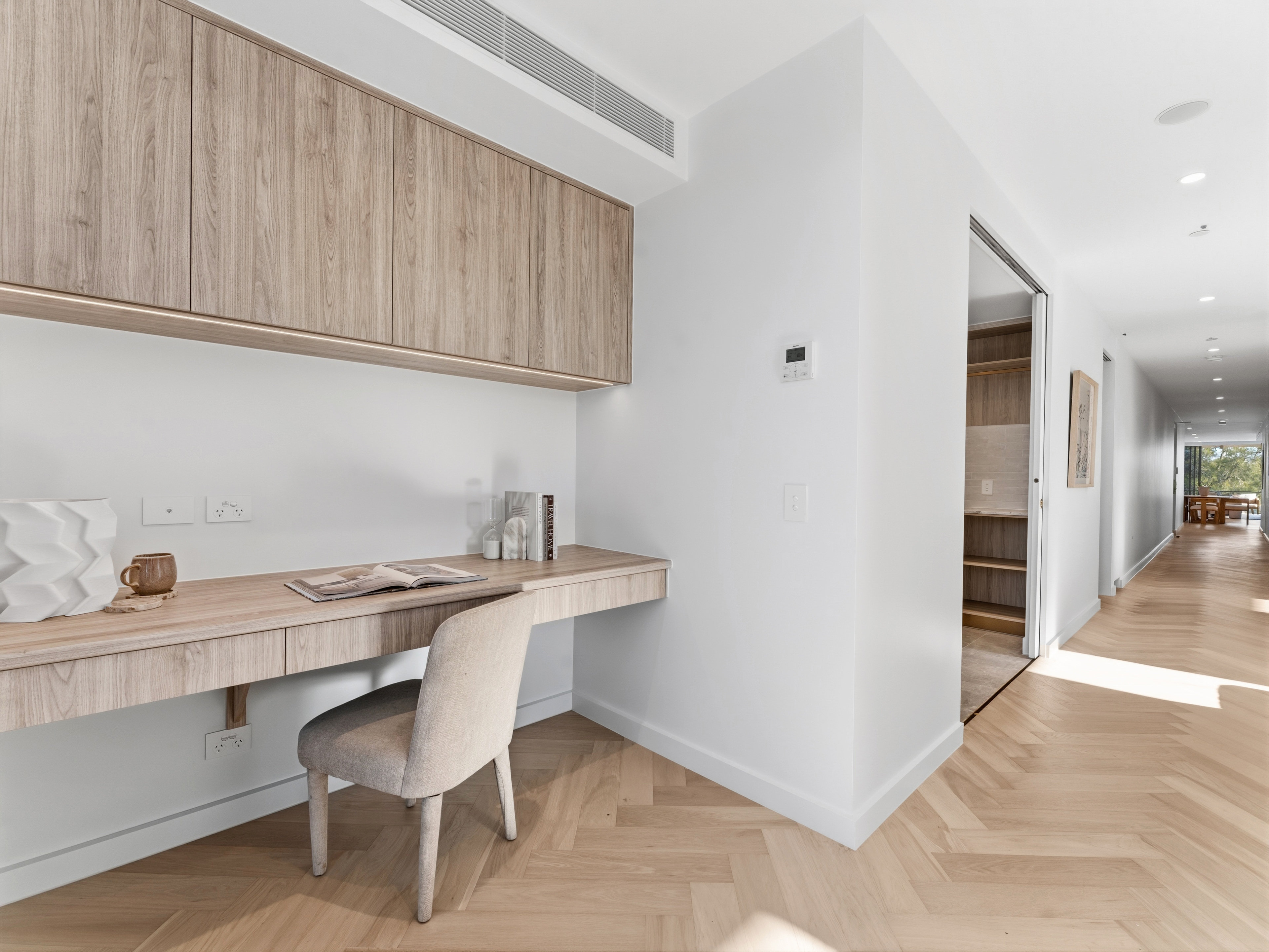 A Deluxe real log fireplace by British Fires anchors the living area with warmth and ambience, while underfloor heating in each ensuite adds a luxurious touch. Ducted air-conditioning and ceiling fans ensure effortless climate control, and intelligent storage solutions throughout reflect the practical generosity of the design.