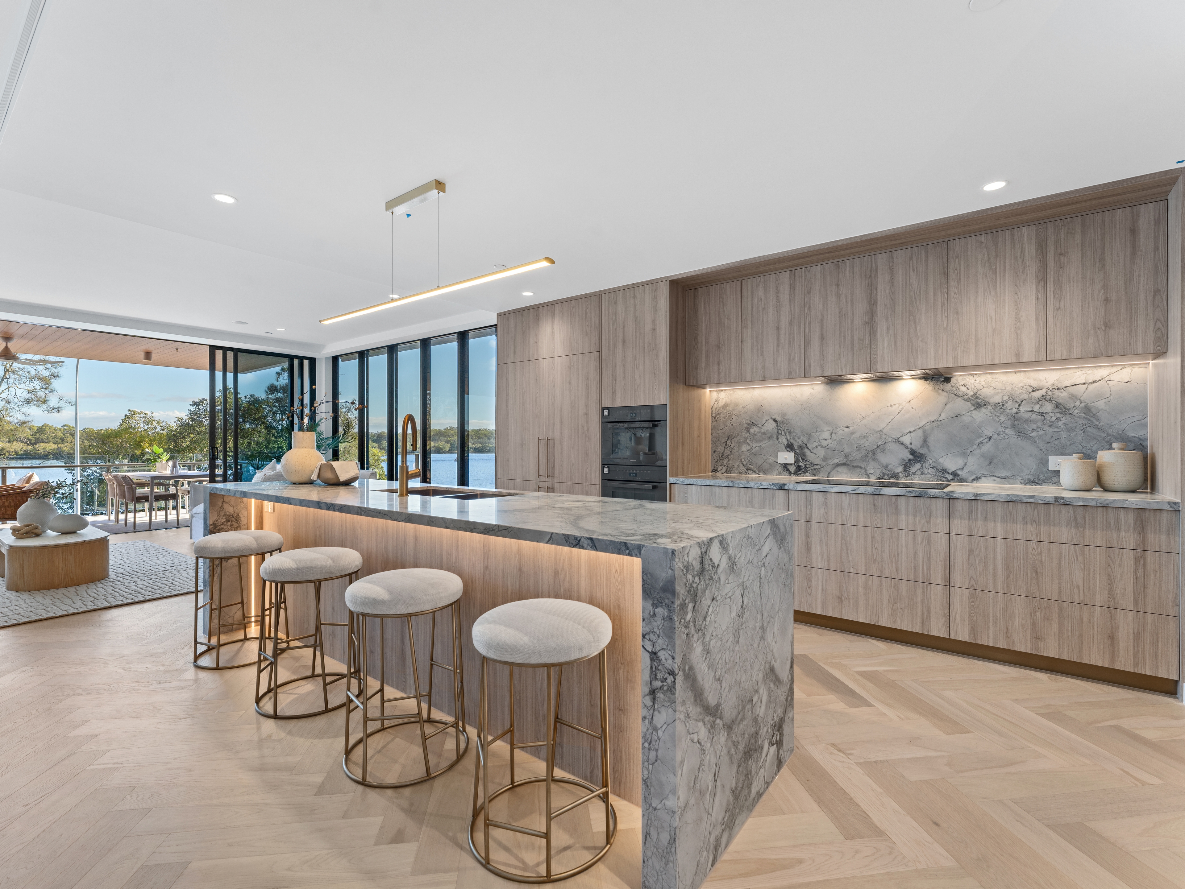 Premium finishes define every space. The designer kitchen features natural stone benchtops, bespoke cabinetry with soft LED lighting and integrated Miele appliances (with five-year warranty), complemented by a fully appointed scullery and wine fridge. The balcony is equally impressive, complete with built-in BBQ and bar fridge, perfect for long lunches or relaxed evenings overlooking the water.