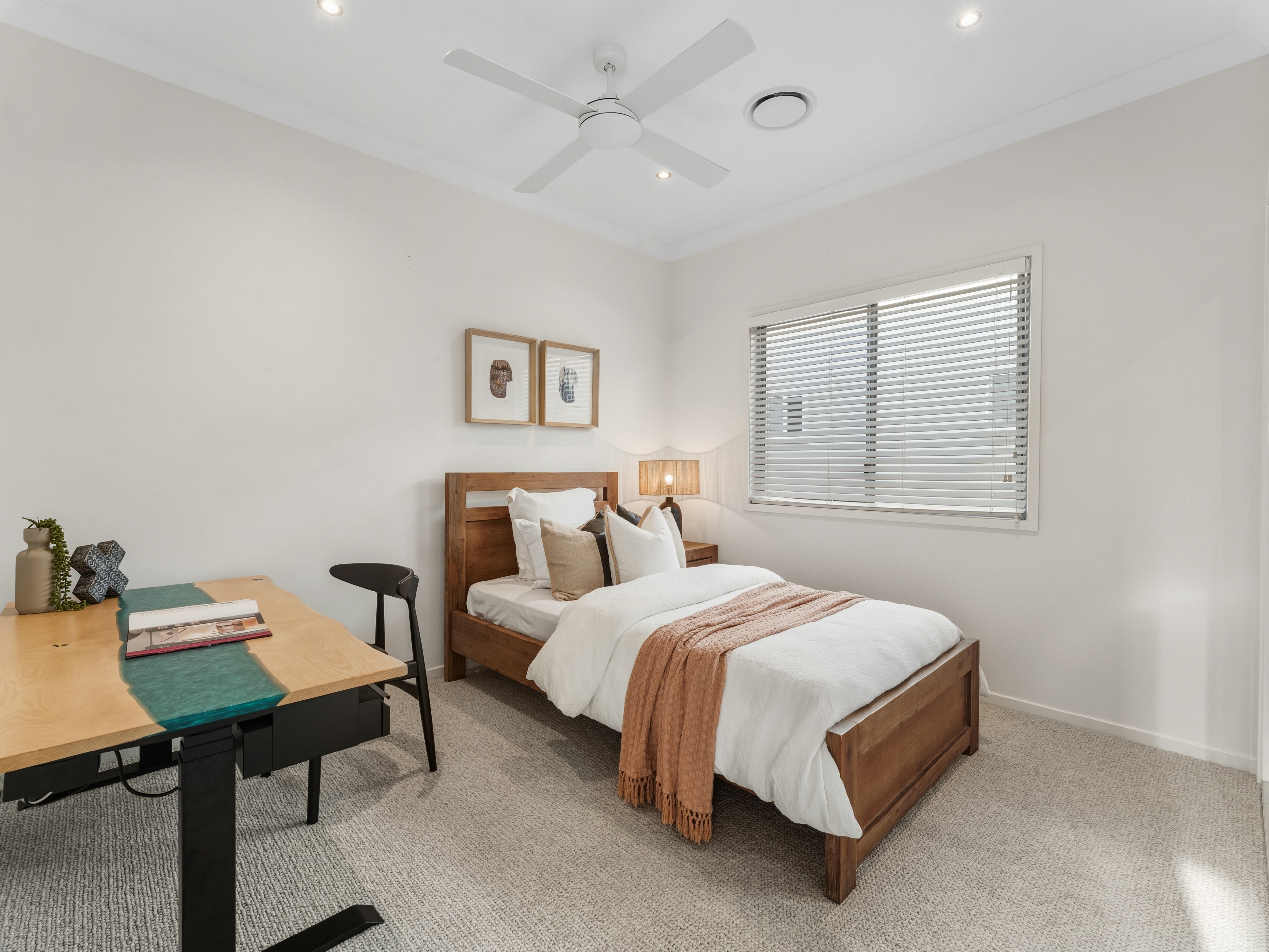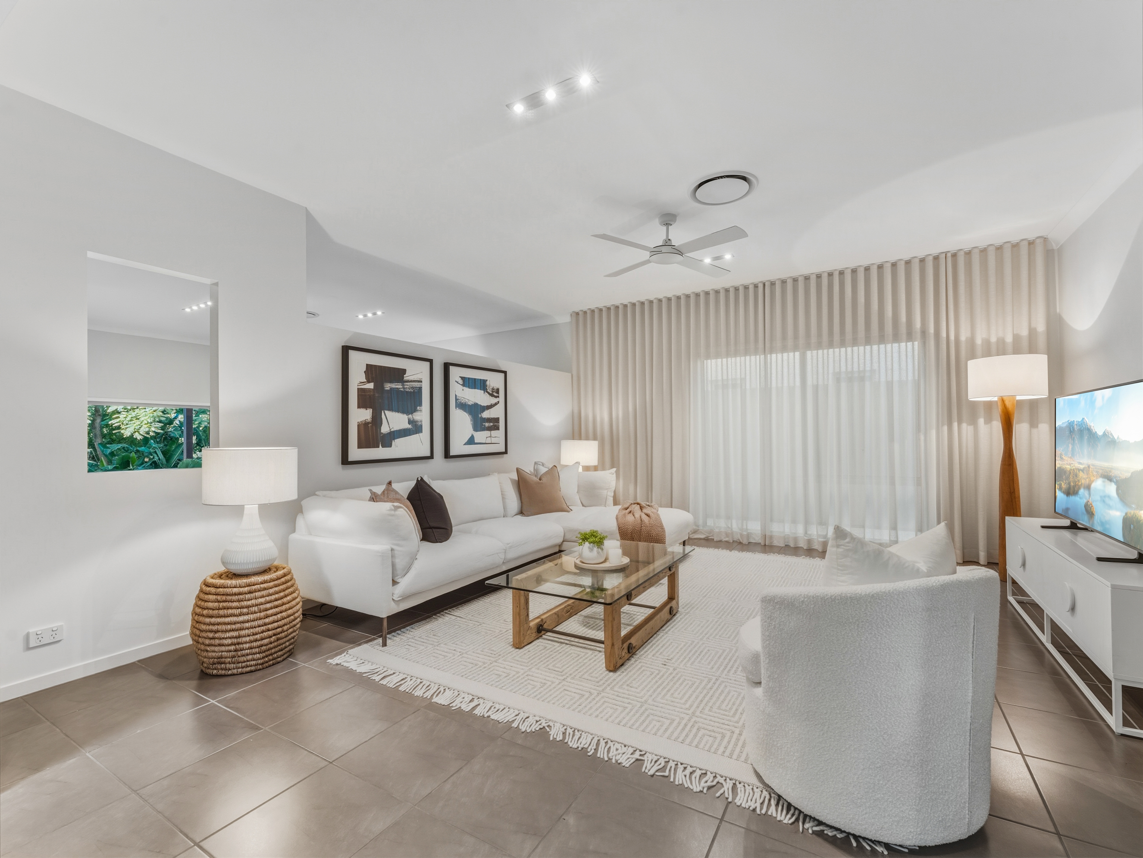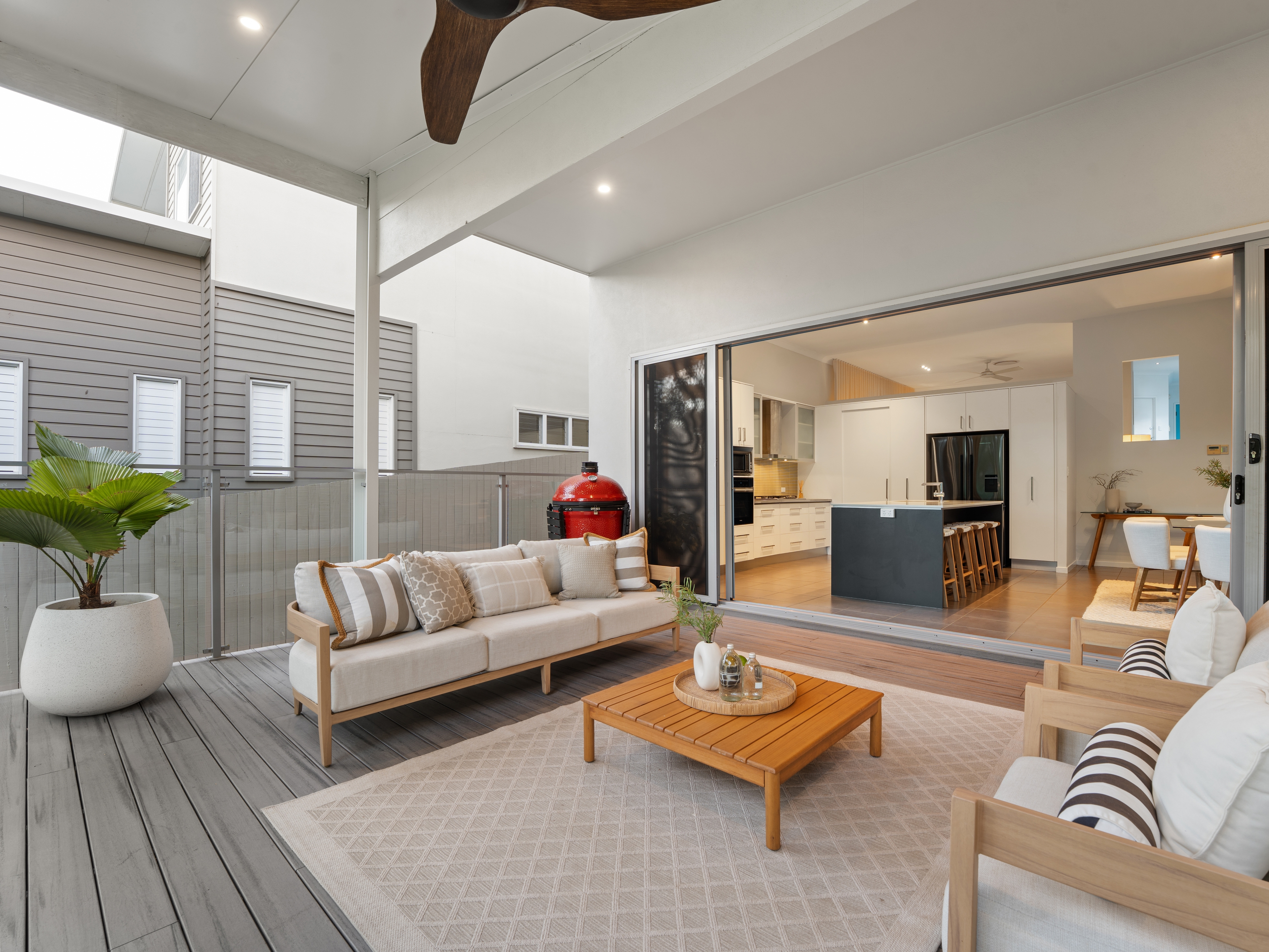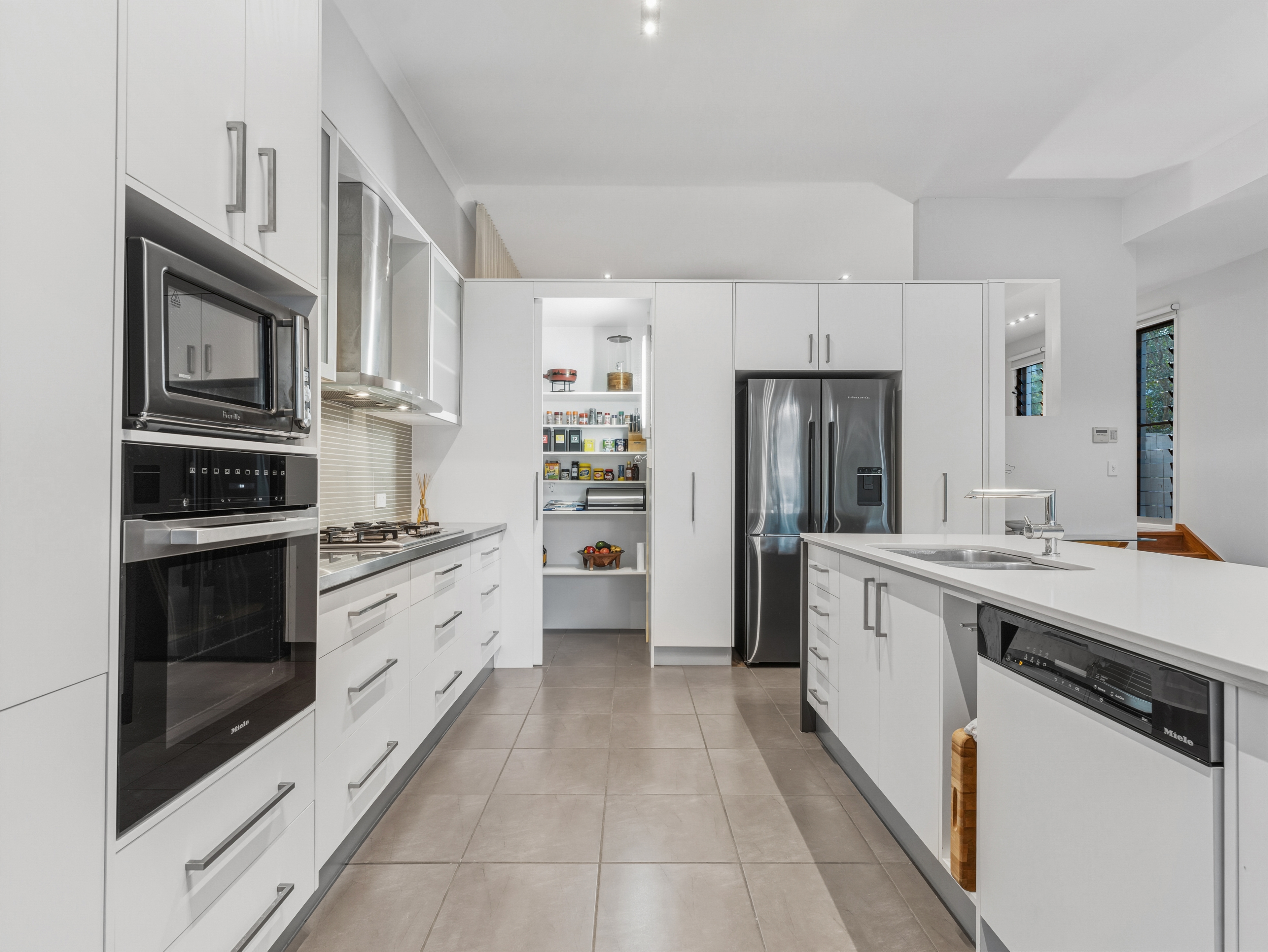 The kitchen is both beautiful and highly functional, featuring elevated ceiling heights, a large island bench, extensive drawers, four pull-out pantries plus a walk-in illuminated pantry. Gas cooking, quality appliances and a double-door (plumbed) fridge space make this a true entertainer’s hub. Full-width sliding doors and security screens open fully seamlessly flowing from the kitchen to the outdoor entertaining deck, perfect for enjoying our Queensland lifestyle.