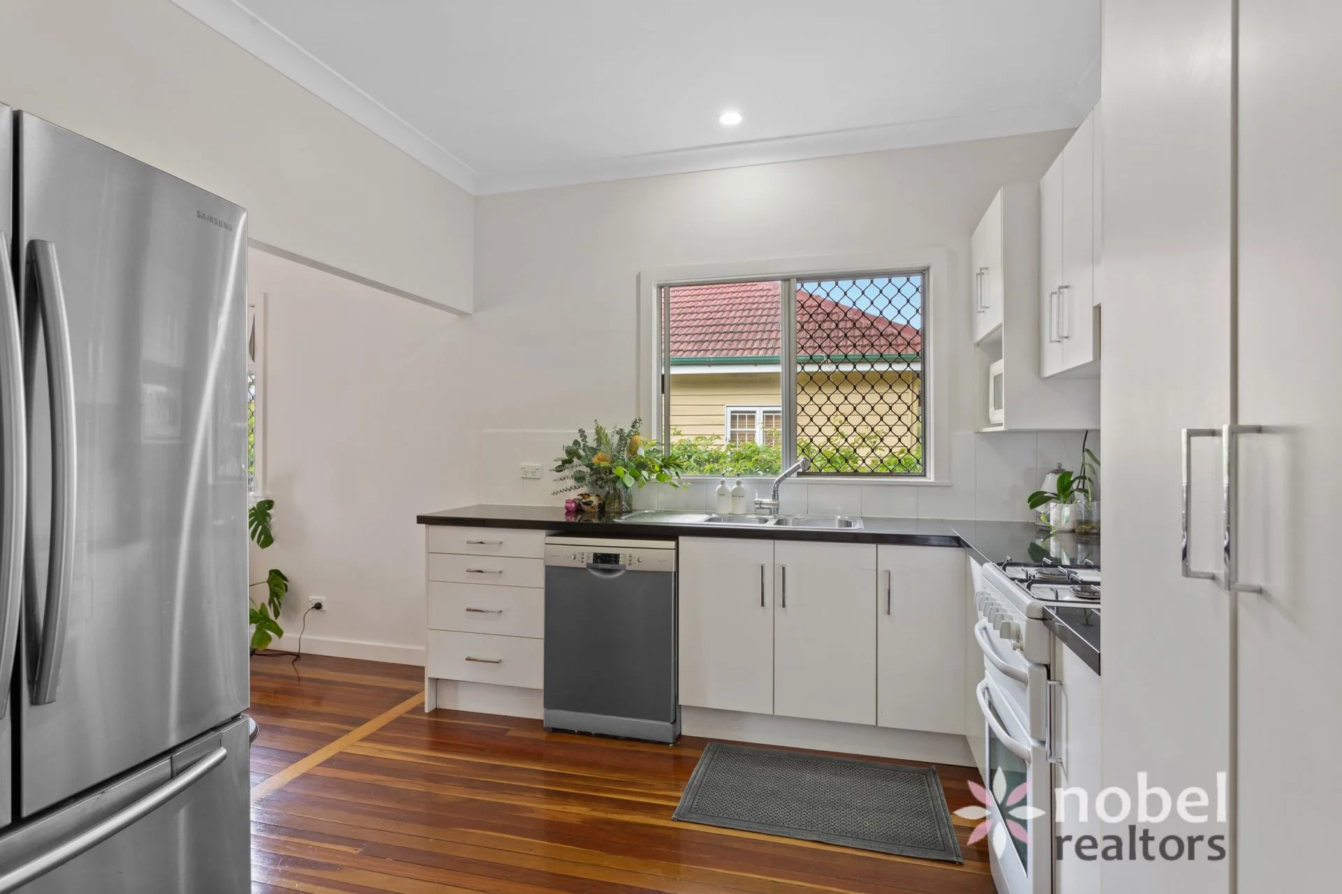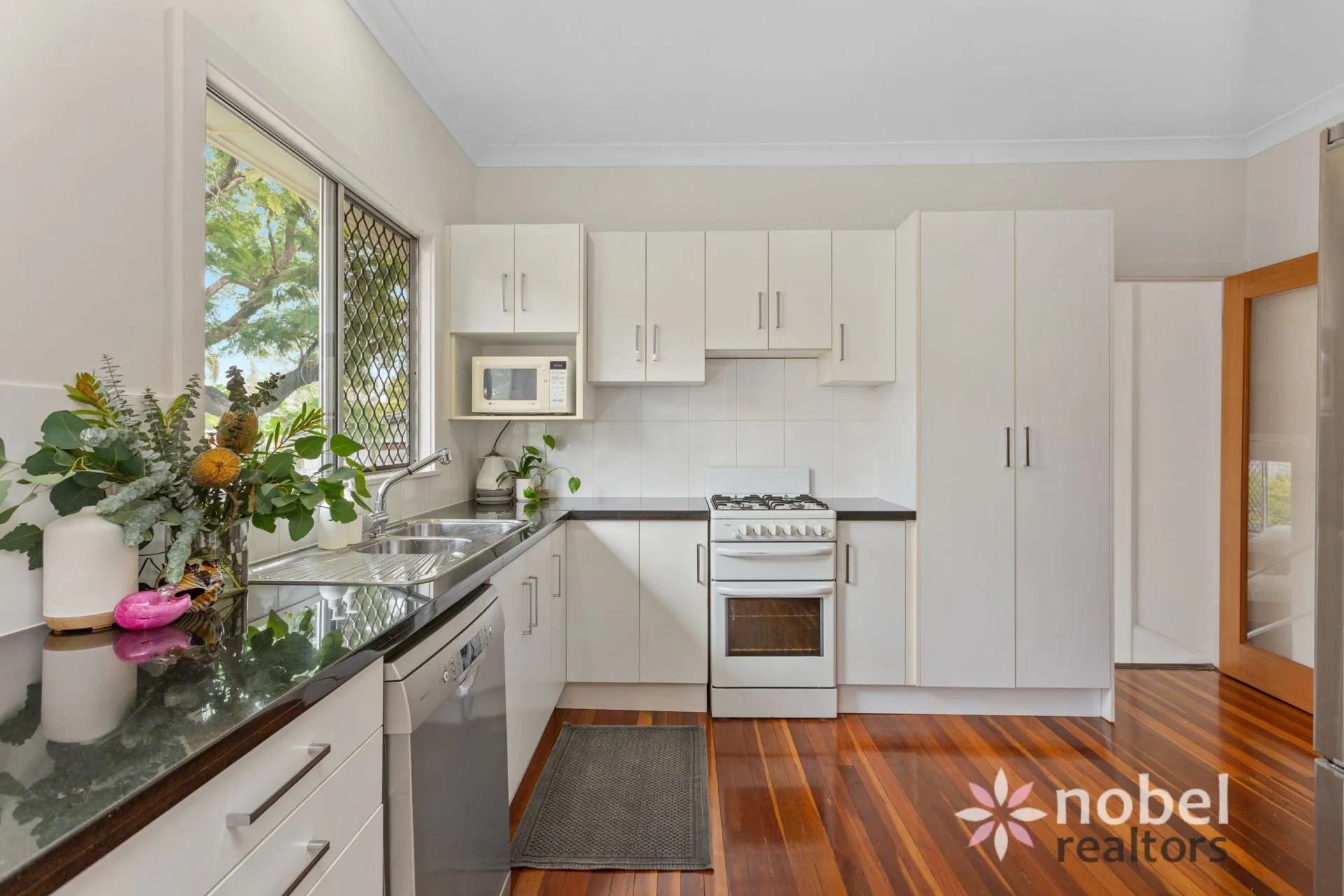 The stunning timber floors continue throughout the home including in the well-appointed kitchen with sweeping benchtops, plenty of storage, a tiled backsplash and a suite of quality appliances including a gas cooktop and a dishwasher.