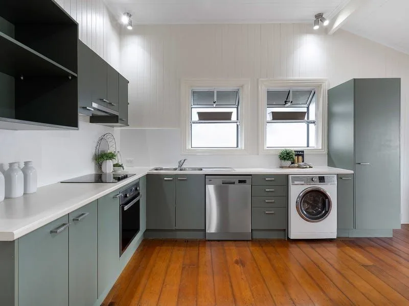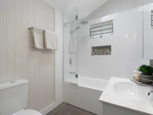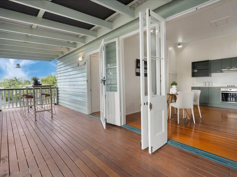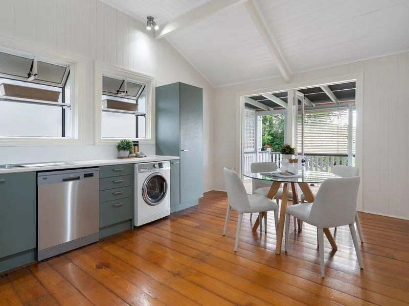 The dining room flows through to the spacious kitchen, featuring an electric stovetop, oven, range hood and dishwasher, offering ample bench space and built-in cabinetry plus pantry for storage. The bathroom displays a chic grey and white colour scheme, incorporating a bath-over-shower combination with recessed shelving, mirrored vanity with storage and toilet. The rear deck overlooks the backyard and can be accessed via the original back door, or dual doors off the kitchen, opening up the space for easy entertaining opportunities.