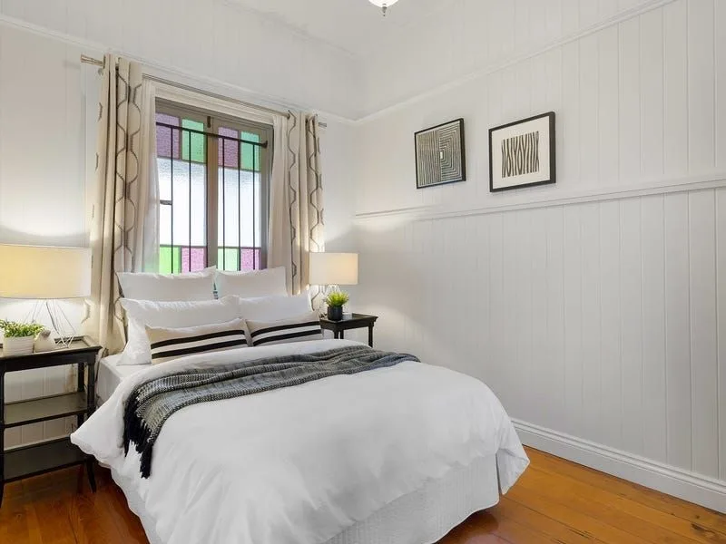 Aesthetically pleasing from the outset, the property boasts a white and navy-blue colour scheme that is balanced by the greenery of the front courtyard gardens. The stairs ascend to the enclosed front porch, with french doors that lead through to the lounge and dining. Inside, the character home flaunts casement windows with stained glass, VJ walls with picture rails, timber floors and decorative breezeways. The two bedrooms are positioned off the living, the main bedroom at the front of the property includes split system air-conditioning.