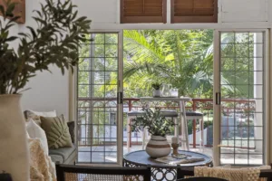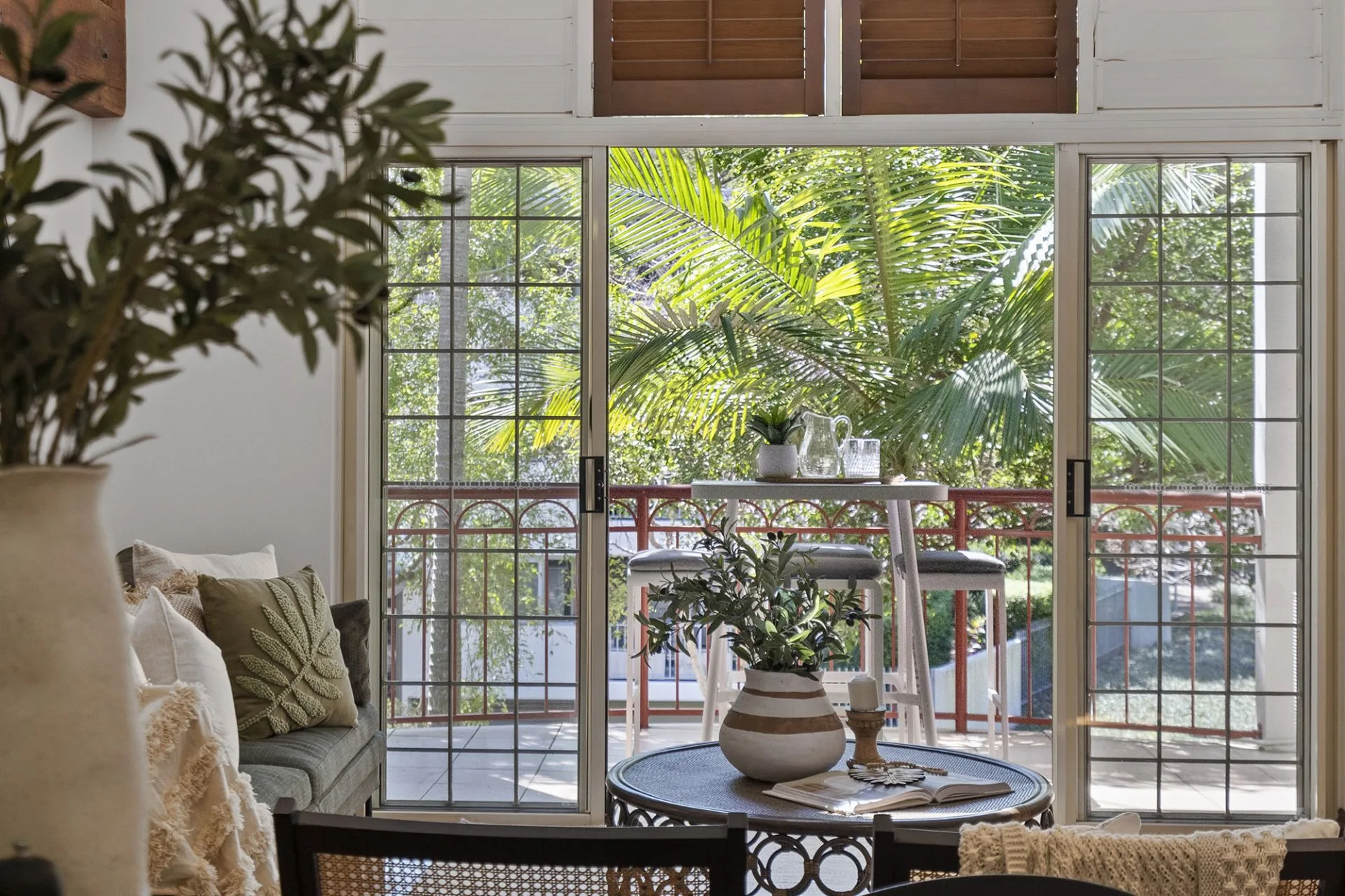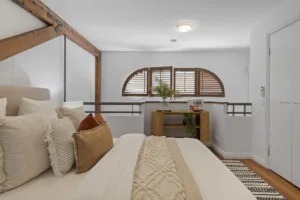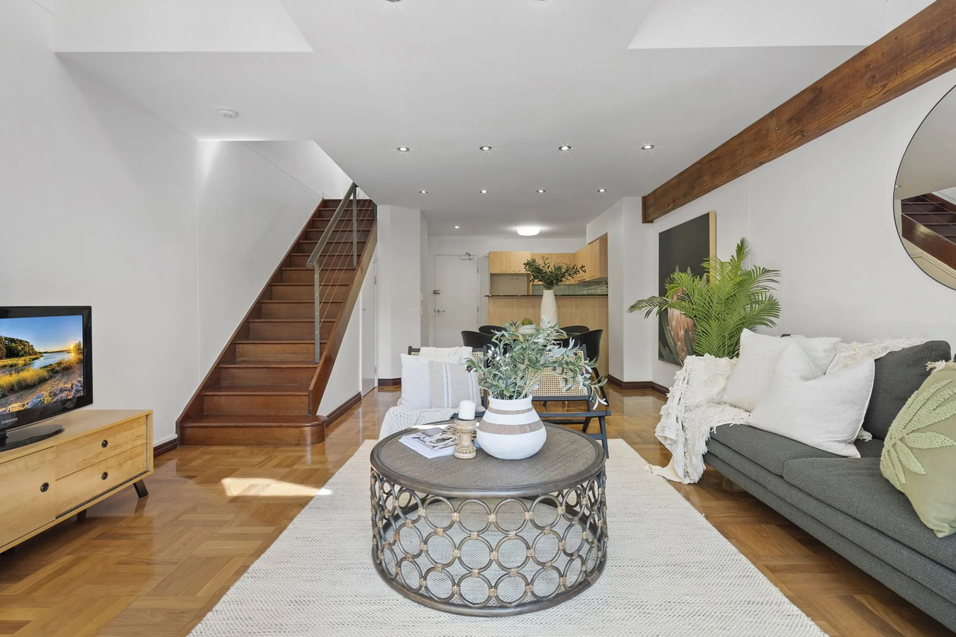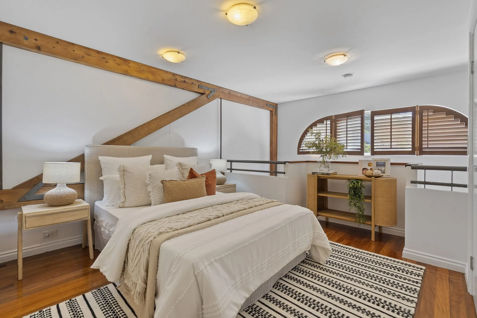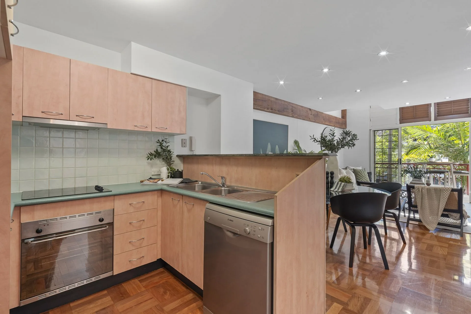 The living area includes a dramatic exposed timber beam in a light-bathed atrium with two sets of shuttered windows. The kitchen features stainless-steel appliances, ceramic cooktop, Bosch dishwasher, double sink and plenty of storage space.