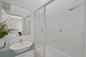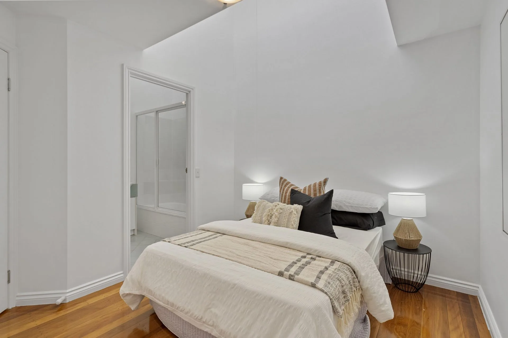 The upper level enjoys polished timber floorboards throughout. Each bedroom has built-in robes and its own ensuite. The master bedroom is a stunning space, open to the atrium and with exposed timbers that criss-cross to form a feature wall. The second bedroom enjoys soaring ceilings with a clerestory window, and the ensuite includes a bath with shower.