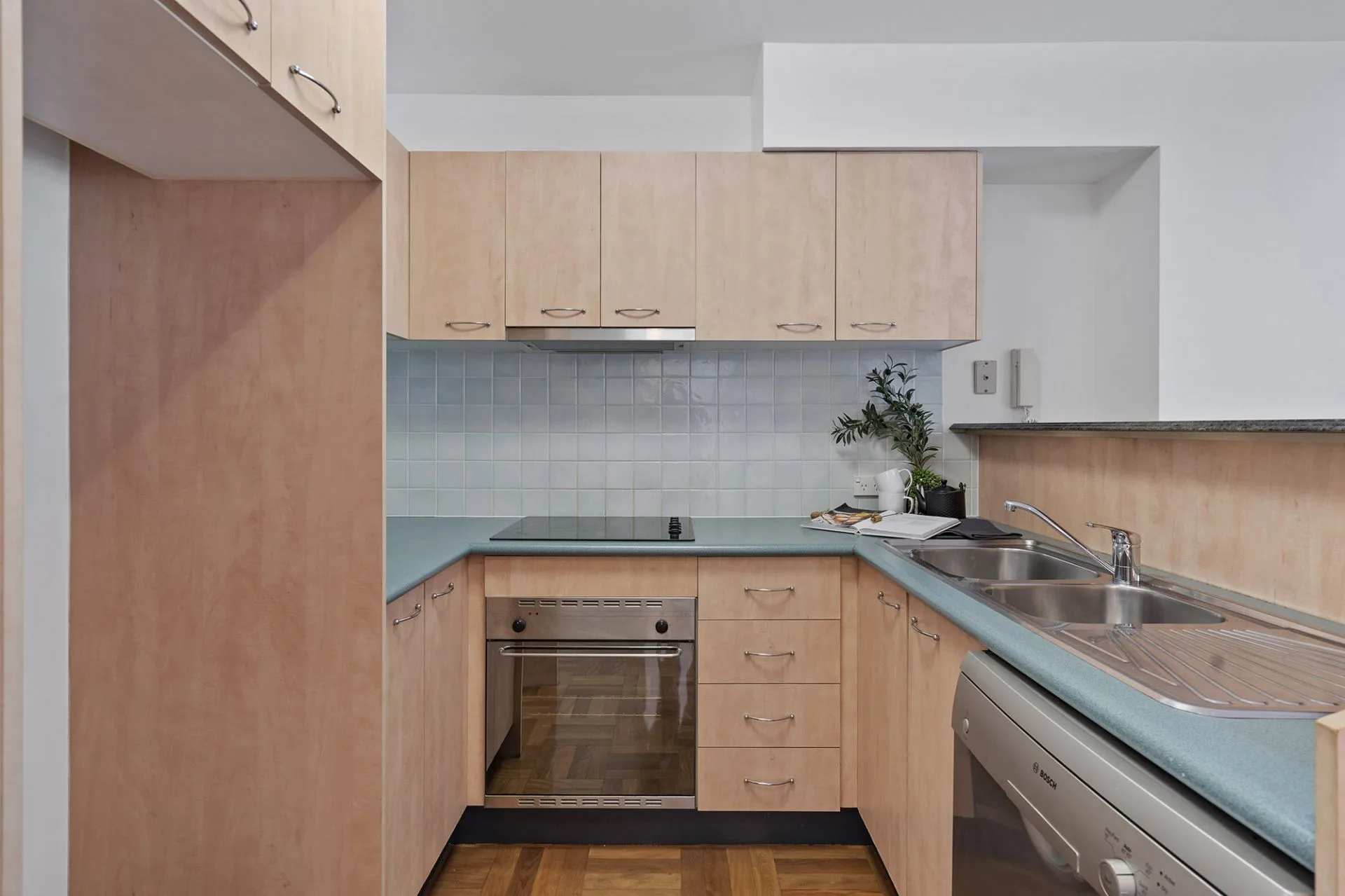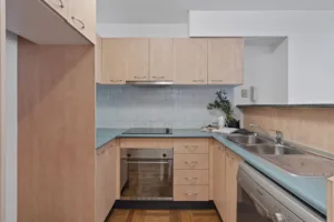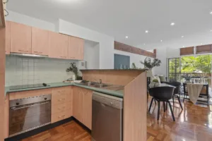 On entering, you are immediately impressed by the polished parquetry floor that runs throughout the open-plan kitchen, dining and living area all the way to sliding windows. These wide windows open onto a north-facing covered balcony with leafy green views, ideal for alfresco dining and entertaining.
