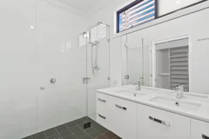 There are four bedrooms, three bathrooms, a separate laundry and a double-car garage. Three bedrooms and two bathrooms feature on the upper floor, including a sublime master retreat, revealing direct access to the entry verandah, a walk-in robe, and a dual vanity ensuite.