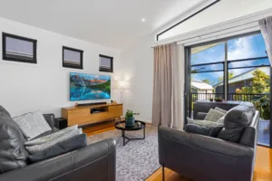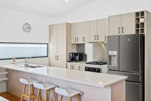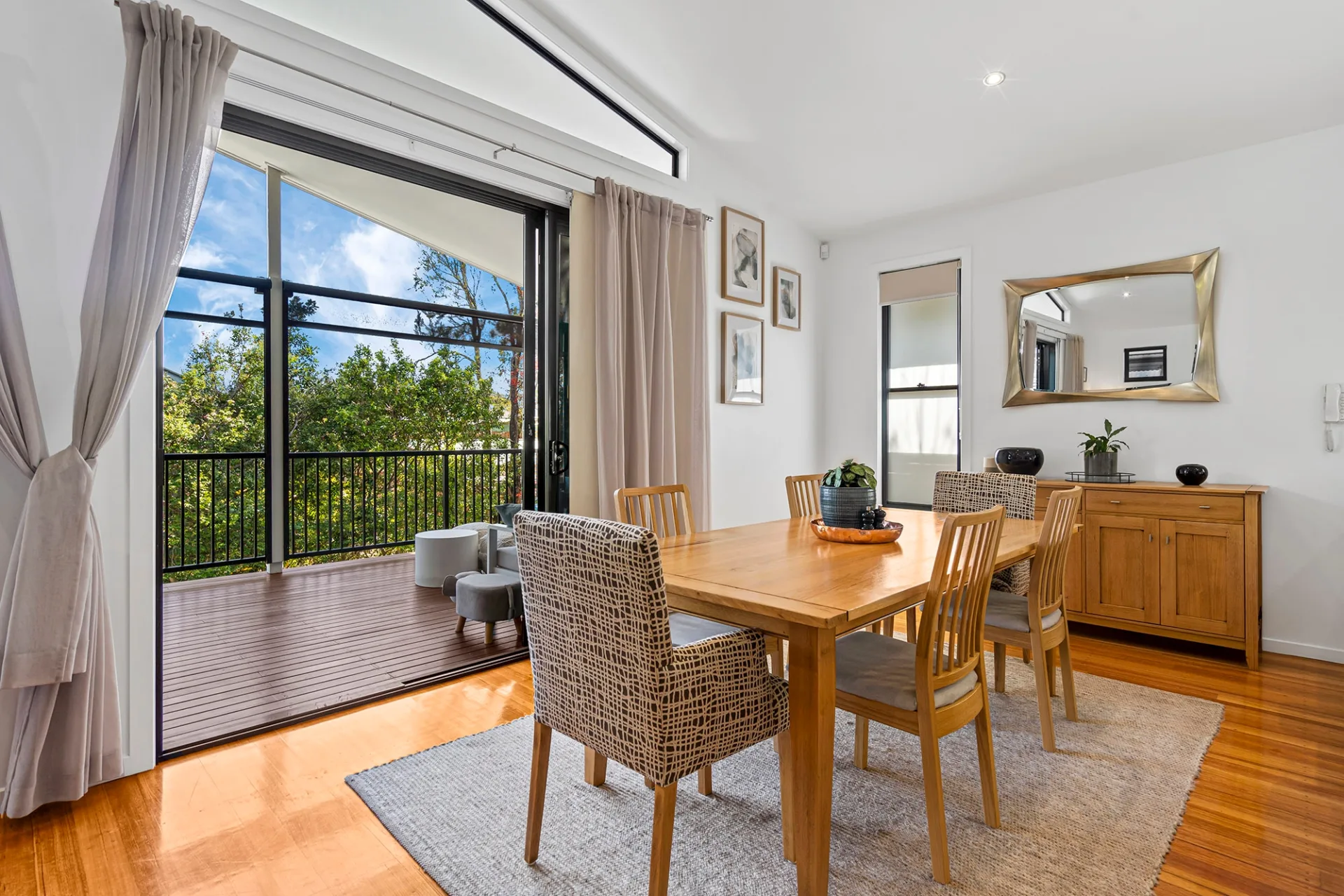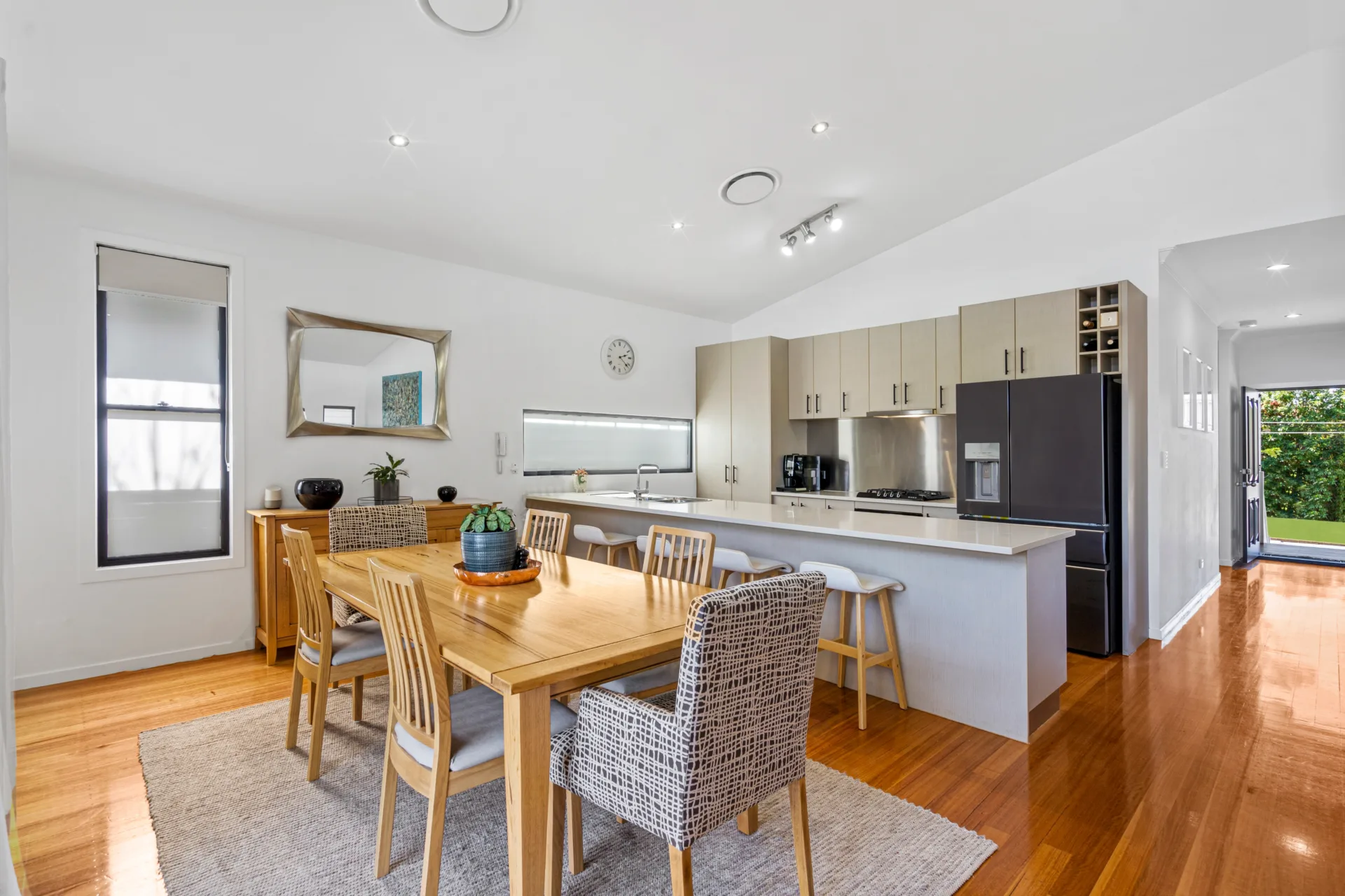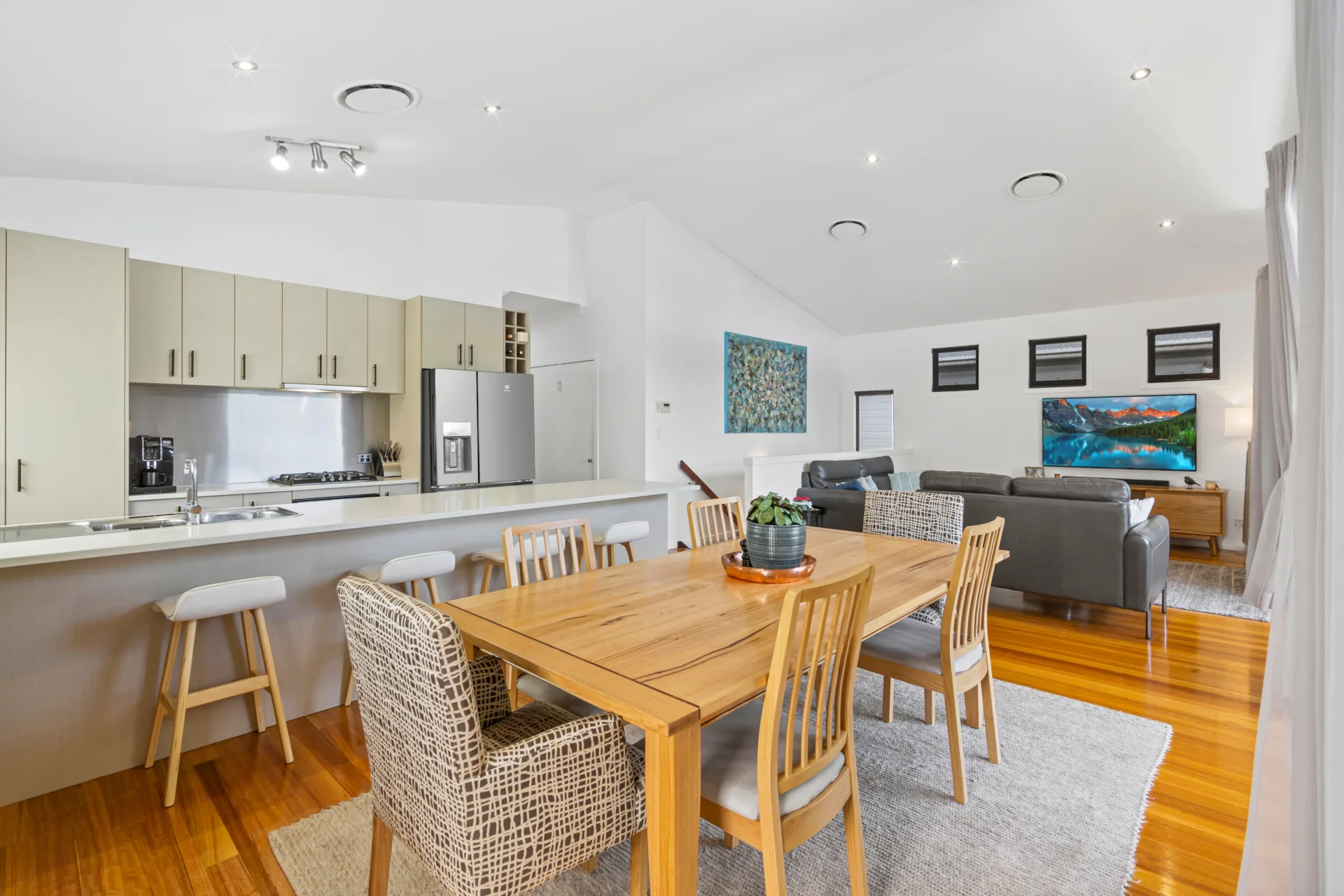 The upper floor has been consciously crafted with an open layout accommodating exquisite indoor entertaining and family gatherings with a free-flowing kitchen, living and dining area showcasing cathedral ceilings and seamless movement to the elevated rear timber deck.
