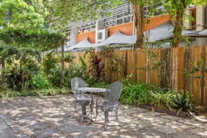 The unit is situated in a small and meticulously maintained complex, surrounded by lush, well-established trees, creating an atmosphere of serenity and privacy.