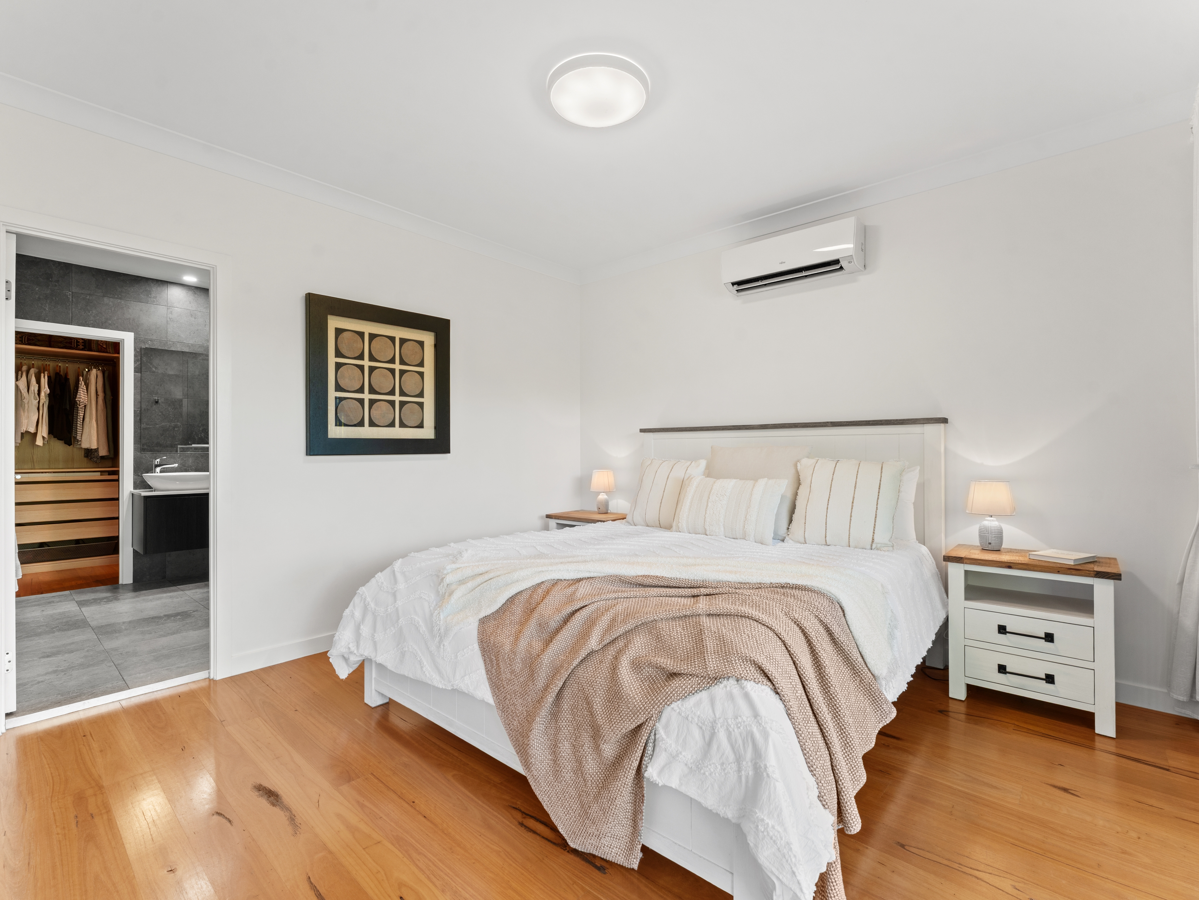 At the centre of the home, open-plan living and dining connect seamlessly to a north-facing entertaining deck overlooking parklands. This elevated outdoor space captures excellent natural light and airflow, extending the living area to outside and providing a practical setting for entertaining, outdoor dining and relaxed everyday use.